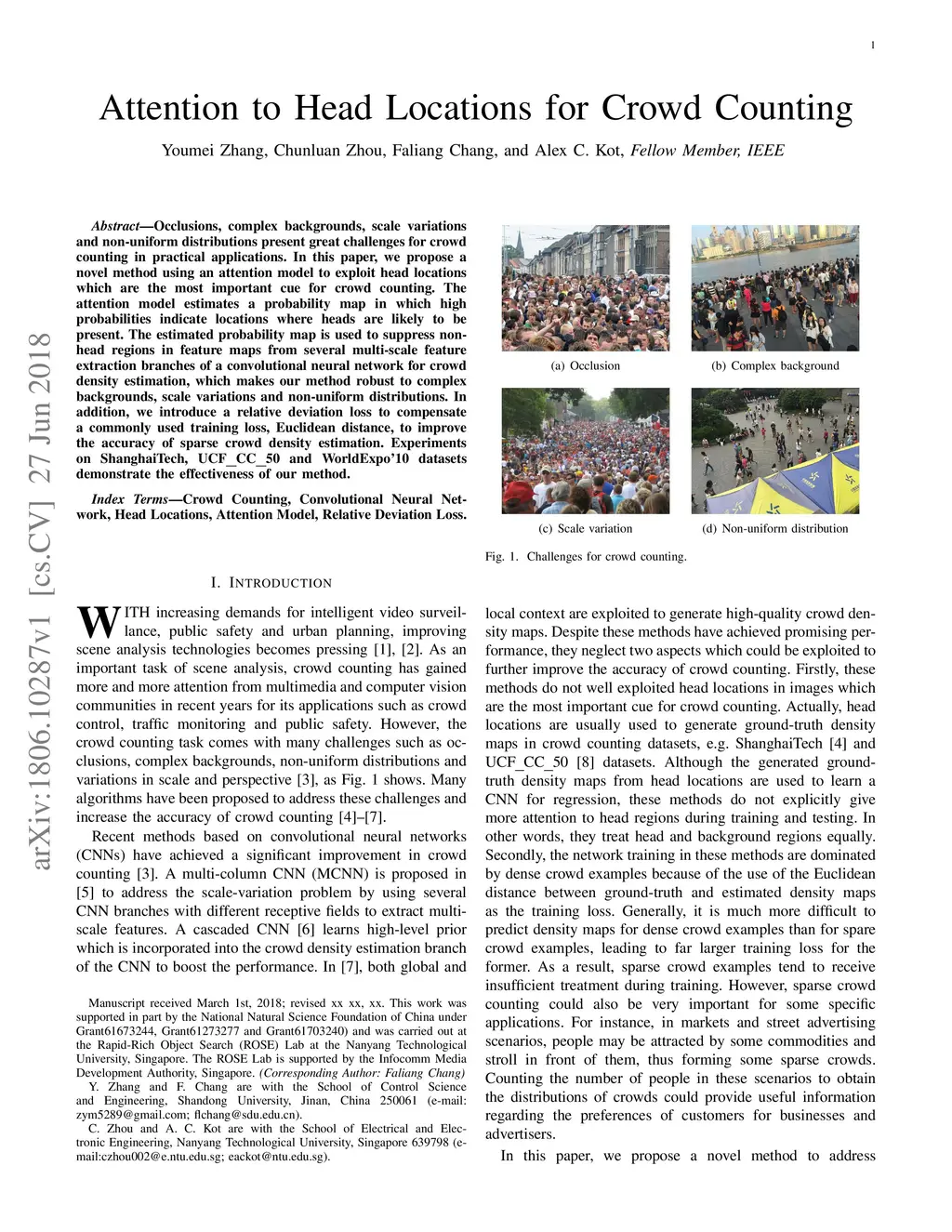 Occlusions, complex backgrounds, scale variations and non-uniform distributions present great challenges for crowd counting in practical applications. In this paper, we propose a novel method using an attention model to exploit head locations which are the most important cue for crowd counting. The attention model estimates a probability map in which high probabilities indicate locations where heads are likely to be present. The estimated probability map is used to suppress non-head regions in feature maps from several multi-scale feature extraction branches of a convolution neural network for crowd density estimation, which makes our method robust to complex backgrounds, scale variations and non-uniform distributions. In addition, we introduce a relative deviation loss to compensate a commonly used training loss, Euclidean distance, to improve the accuracy of sparse crowd density estimation. Experiments on Shanghai-Tech, UCF_CC_50 and World-Expo'10 data sets demonstrate the effectiveness of our method.