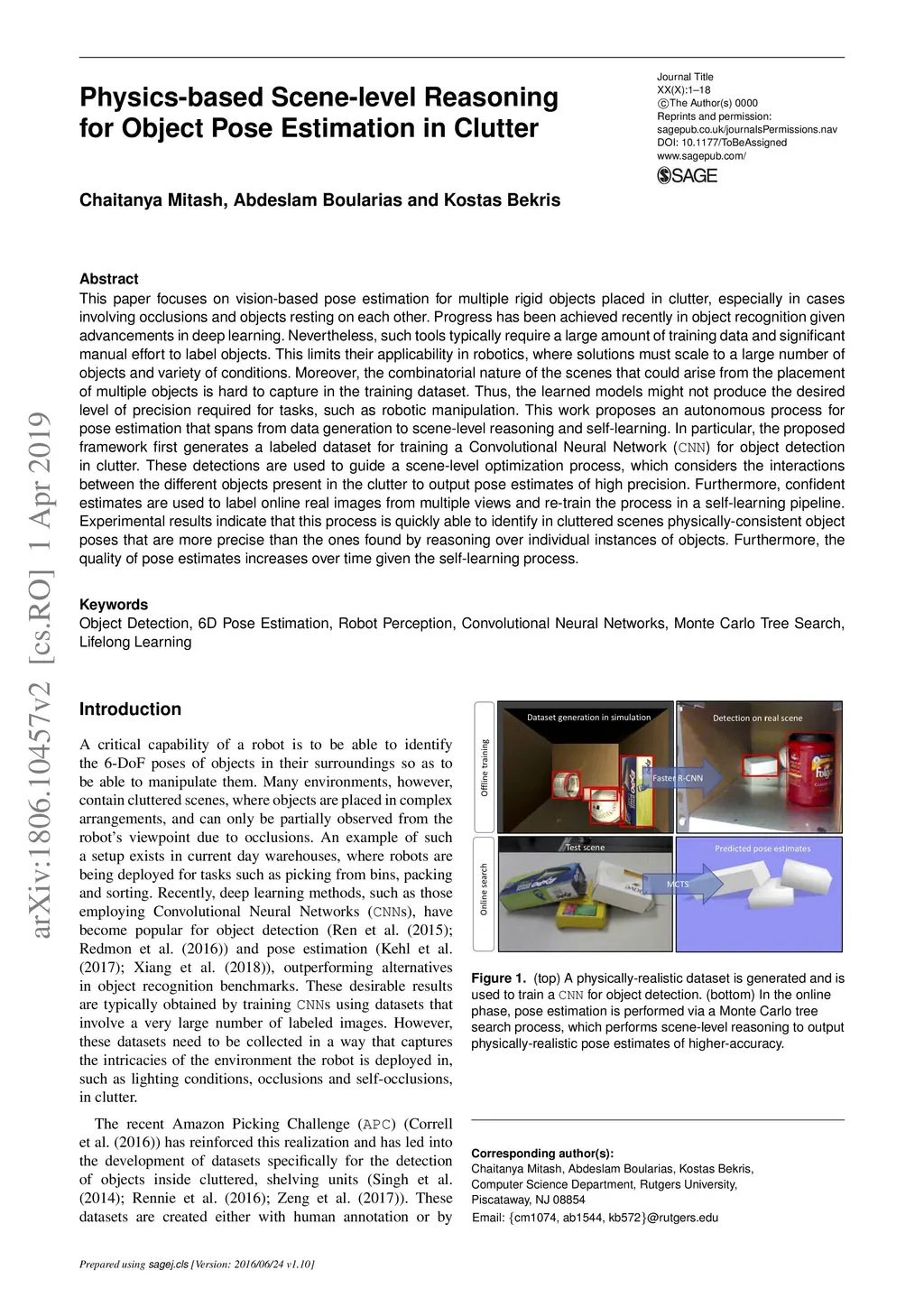 This paper focuses on vision-based pose estimation for multiple rigid objects placed in clutter, especially in cases involving occlusions and objects resting on each other. Progress has been achieved recently in object recognition given advancements in deep learning. Nevertheless, such tools typically require a large amount of training data and significant manual effort to label objects. This limits their applicability in robotics, where solutions must scale to a large number of objects and variety of conditions. Moreover, the combinatorial nature of the scenes that could arise from the placement of multiple objects is hard to capture in the training dataset. Thus, the learned models might not produce the desired level of precision required for tasks, such as robotic manipulation. This work proposes an autonomous process for pose estimation that spans from data generation to scene-level reasoning and self-learning. In particular, the proposed framework first generates a labeled dataset for training a Convolutional Neural Network (CNN) for object detection in clutter. These detections are used to guide a scene-level optimization process, which considers the interactions between the different objects present in the clutter to output pose estimates of high precision. Furthermore, confident estimates are used to label online real images from multiple views and re-train the process in a self-learning pipeline. Experimental results indicate that this process is quickly able to identify in cluttered scenes physically-consistent object poses that are more precise than the ones found by reasoning over individual instances of objects. Furthermore, the quality of pose estimates increases over time given the self-learning process.