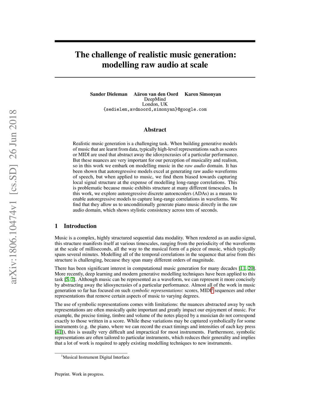 Realistic music generation is a challenging task. When building generative models of music that are learnt from data, typically high-level representations such as scores or MIDI are used that abstract away the idiosyncrasies of a particular performance. But these nuances are very important for our perception of musicality and realism, so in this work we embark on modelling music in the raw audio domain. It has been shown that autoregressive models excel at generating raw audio waveforms of speech, but when applied to music, we find them biased towards capturing local signal structure at the expense of modelling long-range correlations. This is problematic because music exhibits structure at many different timescales. In this work, we explore autoregressive discrete autoencoders (ADAs) as a means to enable autoregressive models to capture long-range correlations in waveforms. We find that they allow us to unconditionally generate piano music directly in the raw audio domain, which shows stylistic consistency across tens of seconds.
