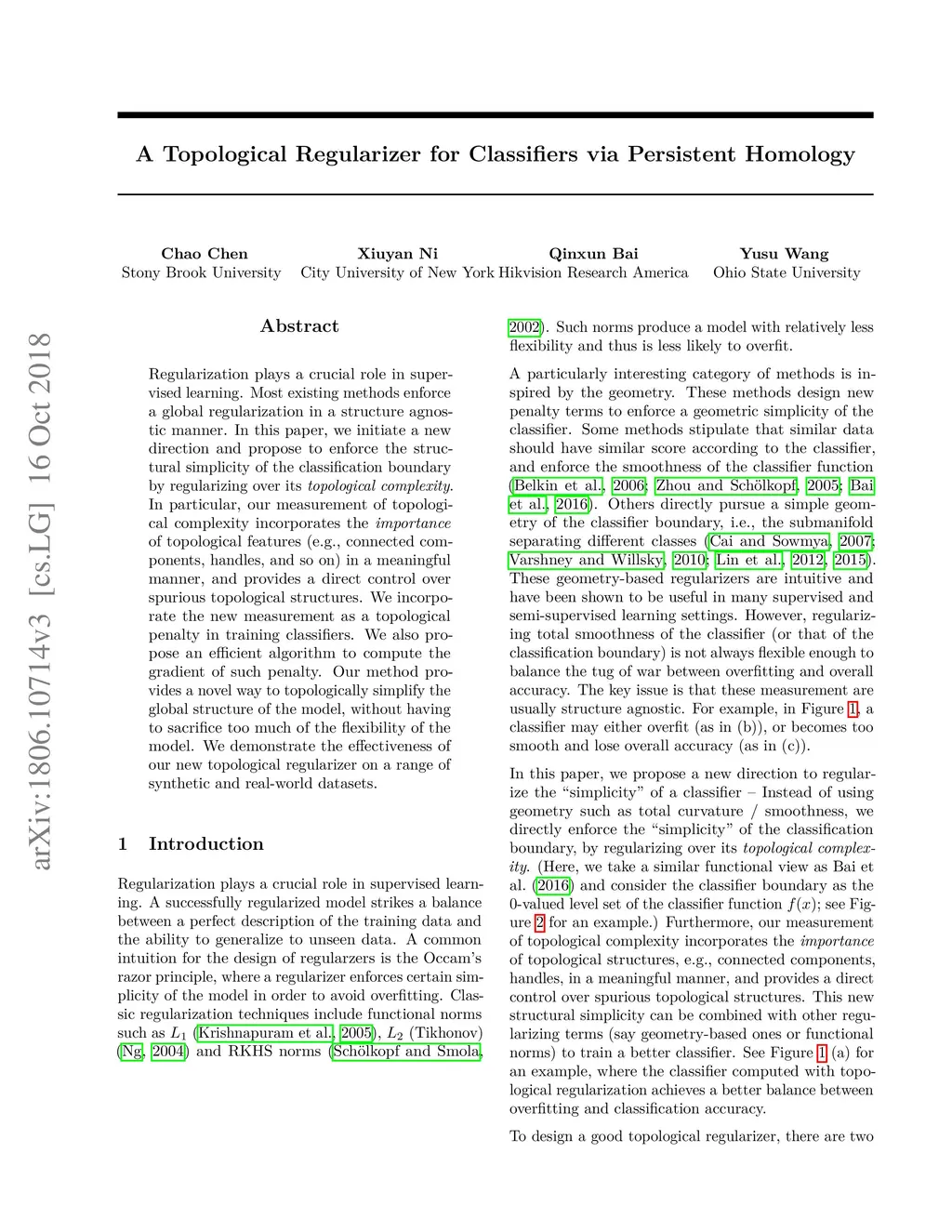 Regularization plays a crucial role in supervised learning. Most existing methods enforce a global regularization in a structure agnostic manner. In this paper, we initiate a new direction and propose to enforce the structural simplicity of the classification boundary by regularizing over its topological complexity. In particular, our measurement of topological complexity incorporates the importance of topological features (e.g., connected components, handles, and so on) in a meaningful manner, and provides a direct control over spurious topological structures. We incorporate the new measurement as a topological penalty in training classifiers. We also pro- pose an efficient algorithm to compute the gradient of such penalty. Our method pro- vides a novel way to topologically simplify the global structure of the model, without having to sacrifice too much of the flexibility of the model. We demonstrate the effectiveness of our new topological regularizer on a range of synthetic and real-world datasets.