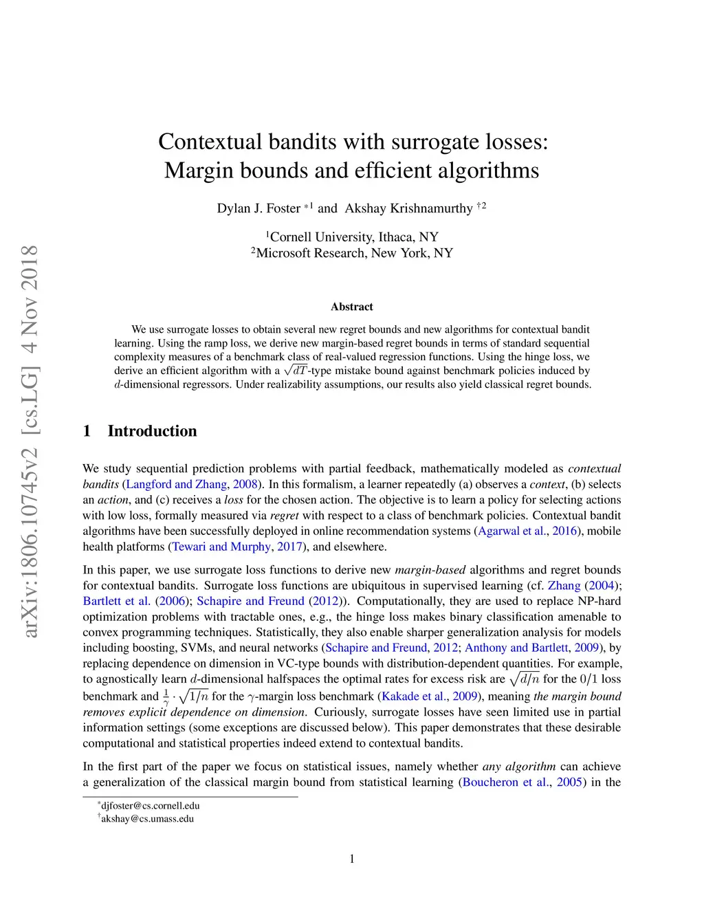 We use surrogate losses to obtain several new regret bounds and new algorithms for contextual bandit learning. Using the ramp loss, we derive new margin-based regret bounds in terms of standard sequential complexity measures of a benchmark class of real-valued regression functions. Using the hinge loss, we derive an efficient algorithm with a -type mistake bound against benchmark policies induced by -dimensional regressors. Under realizability assumptions, our results also yield classical regret bounds.