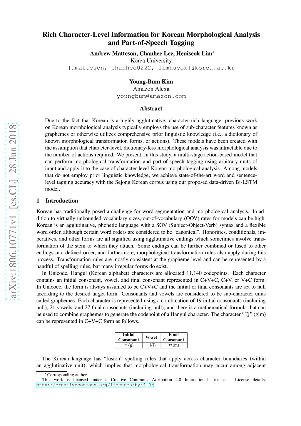 Due to the fact that Korean is a highly agglutinative, character-rich language, previous work on Korean morphological analysis typically employs the use of sub-character features known as graphemes or otherwise utilizes comprehensive prior linguistic knowledge (i.e., a dictionary of known morphological transformation forms, or actions). These models have been created with the assumption that character-level, dictionary-less morphological analysis was intractable due to the number of actions required. We present, in this study, a multi-stage action-based model that can perform morphological transformation and part-of-speech tagging using arbitrary units of input and apply it to the case of character-level Korean morphological analysis. Among models that do not employ prior linguistic knowledge, we achieve state-of-the-art word and sentence-level tagging accuracy with the Sejong Korean corpus using our proposed data-driven Bi-LSTM model.