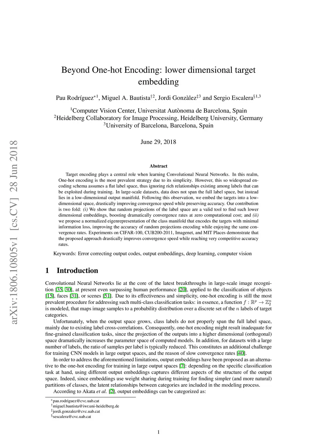 Target encoding plays a central role when learning Convolutional Neural Networks. In this realm, One-hot encoding is the most prevalent strategy due to its simplicity. However, this so widespread encoding schema assumes a flat label space, thus ignoring rich relationships existing among labels that can be exploited during training. In large-scale datasets, data does not span the full label space, but instead lies in a low-dimensional output manifold. Following this observation, we embed the targets into a low-dimensional space, drastically improving convergence speed while preserving accuracy. Our contribution is two fold: (i) We show that random projections of the label space are a valid tool to find such lower dimensional embeddings, boosting dramatically convergence rates at zero computational cost; and (ii) we propose a normalized eigenrepresentation of the class manifold that encodes the targets with minimal information loss, improving the accuracy of random projections encoding while enjoying the same convergence rates. Experiments on CIFAR-100, CUB200-2011, Imagenet, and MIT Places demonstrate that the proposed approach drastically improves convergence speed while reaching very competitive accuracy rates.