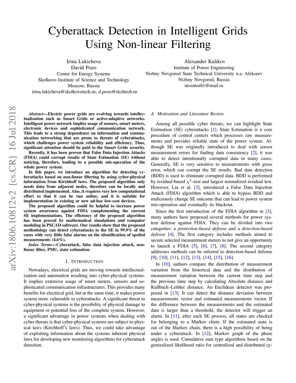 Cyberattack Detection in Intelligent Grids Using Non-linear Filtering