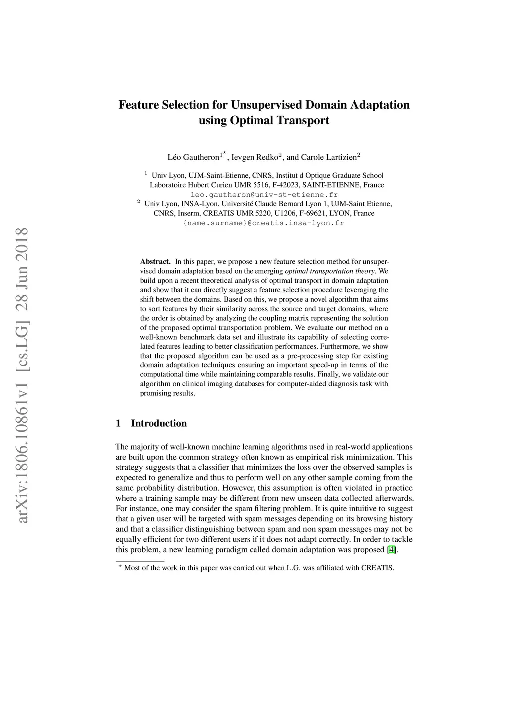 In this paper, we propose a new feature selection method for unsupervised domain adaptation based on the emerging optimal transportation theory. We build upon a recent theoretical analysis of optimal transport in domain adaptation and show that it can directly suggest a feature selection procedure leveraging the shift between the domains. Based on this, we propose a novel algorithm that aims to sort features by their similarity across the source and target domains, where the order is obtained by analyzing the coupling matrix representing the solution of the proposed optimal transportation problem. We evaluate our method on a well-known benchmark data set and illustrate its capability of selecting correlated features leading to better classification performances. Furthermore, we show that the proposed algorithm can be used as a pre-processing step for existing domain adaptation techniques ensuring an important speed-up in terms of the computational time while maintaining comparable results. Finally, we validate our algorithm on clinical imaging databases for computer-aided diagnosis task with promising results.