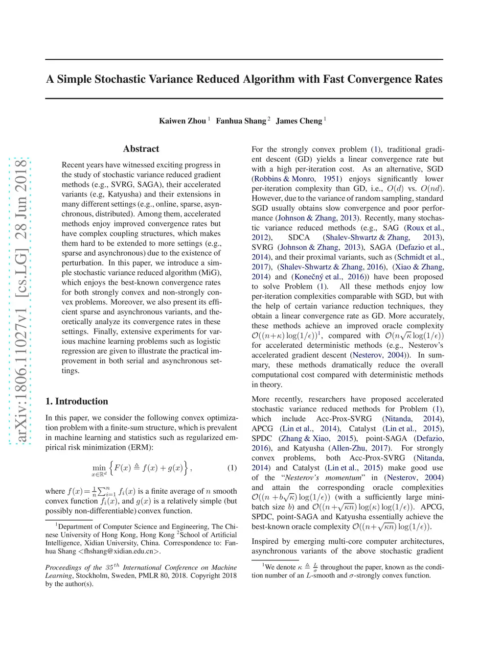 Recent years have witnessed exciting progress in the study of stochastic variance reduced gradient methods (e.g., SVRG, SAGA), their accelerated variants (e.g, Katyusha) and their extensions in many different settings (e.g., online, sparse, asynchronous, distributed). Among them, accelerated methods enjoy improved convergence rates but have complex coupling structures, which makes them hard to be extended to more settings (e.g., sparse and asynchronous) due to the existence of perturbation. In this paper, we introduce a simple stochastic variance reduced algorithm (MiG), which enjoys the best-known convergence rates for both strongly convex and non-strongly convex problems. Moreover, we also present its efficient sparse and asynchronous variants, and theoretically analyze its convergence rates in these settings. Finally, extensive experiments for various machine learning problems such as logistic regression are given to illustrate the practical improvement in both serial and asynchronous settings.