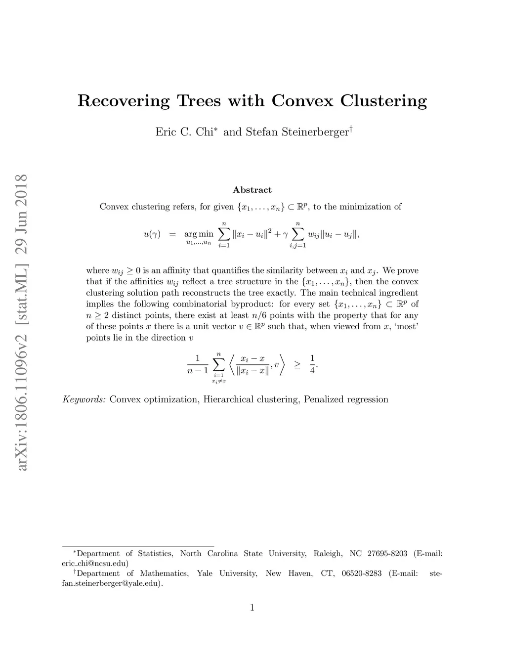 Convex clustering refers, for given , to the minimization of \begin{eqnarray*} u(\gamma) & = & \underset{u_1, \dots, u_n }{\arg\min}\;\sum_{i=1}^{n}{\lVert x_i - u_i \rVert^2} + \gamma \sum_{i,j=1}^{n}{w_{ij} \lVert u_i - u_j\rVert},\\ \end{eqnarray*} where is an affinity that quantifies the similarity between and . We prove that if the affinities reflect a tree structure in the , then the convex clustering solution path reconstructs the tree exactly. The main technical ingredient implies the following combinatorial byproduct: for every set of distinct points, there exist at least points with the property that for any of these points there is a unit vector such that, when viewed from , `most' points lie in the direction \begin{eqnarray*} \frac{1}{n-1}\sum_{i=1 \atop x_i \neq x}^{n}{ \left\langle \frac{x_i - x}{\lVert x_i - x \rVert}, v \right\rangle} & \geq & \frac{1}{4}. \end{eqnarray*}