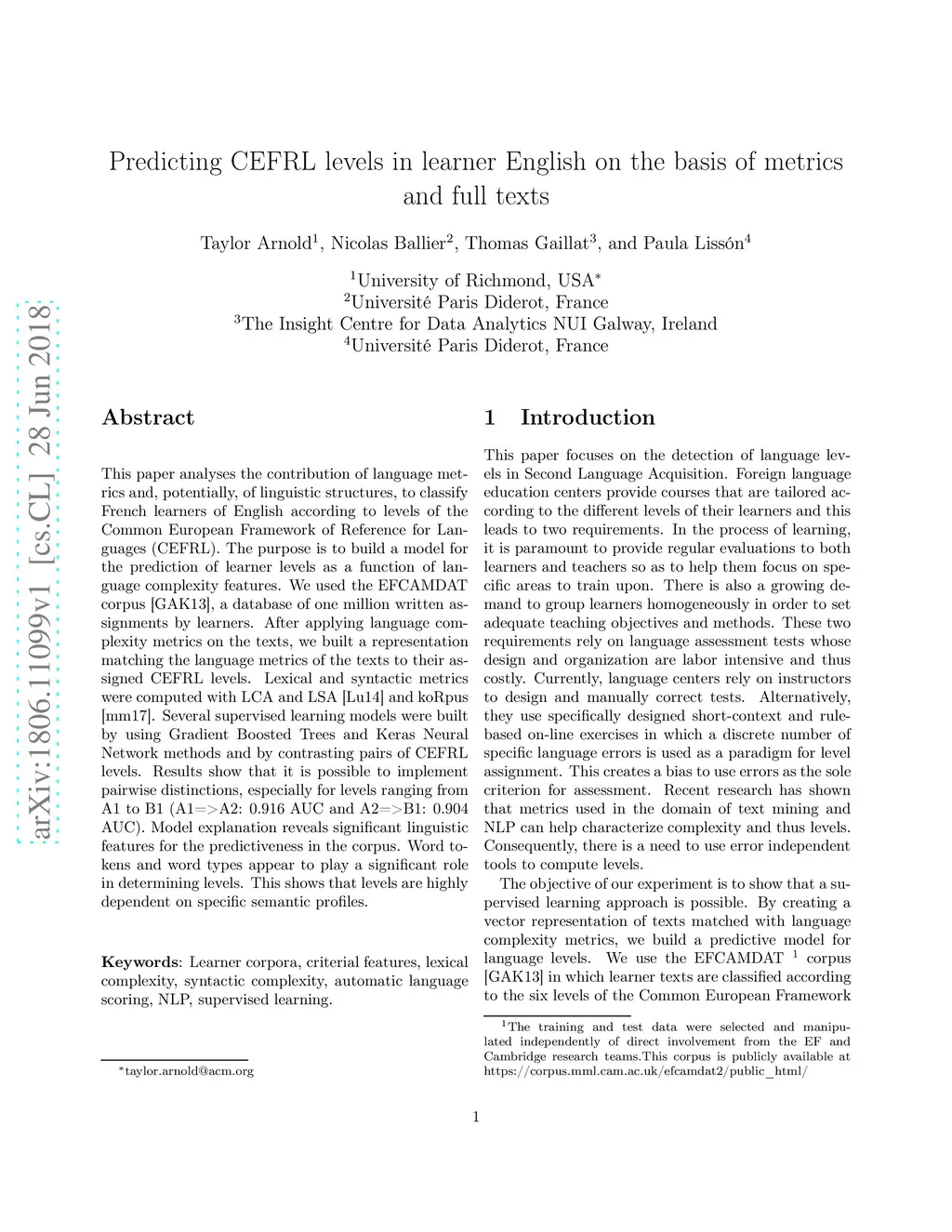 This paper analyses the contribution of language metrics and, potentially, of linguistic structures, to classify French learners of English according to levels of the Common European Framework of Reference for Languages (CEFRL). The purpose is to build a model for the prediction of learner levels as a function of language complexity features. We used the EFCAMDAT corpus, a database of one million written assignments by learners. After applying language complexity metrics on the texts, we built a representation matching the language metrics of the texts to their assigned CEFRL levels. Lexical and syntactic metrics were computed with LCA, LSA, and koRpus. Several supervised learning models were built by using Gradient Boosted Trees and Keras Neural Network methods and by contrasting pairs of CEFRL levels. Results show that it is possible to implement pairwise distinctions, especially for levels ranging from A1 to B1 (A1=>A2: 0.916 AUC and A2=>B1: 0.904 AUC). Model explanation reveals significant linguistic features for the predictiveness in the corpus. Word tokens and word types appear to play a significant role in determining levels. This shows that levels are highly dependent on specific semantic profiles.