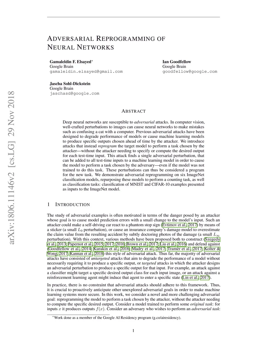 Deep neural networks are susceptible to \emph{adversarial} attacks. In computer vision, well-crafted perturbations to images can cause neural networks to make mistakes such as confusing a cat with a computer. Previous adversarial attacks have been designed to degrade performance of models or cause machine learning models to produce specific outputs chosen ahead of time by the attacker. We introduce attacks that instead {\em reprogram} the target model to perform a task chosen by the attacker---without the attacker needing to specify or compute the desired output for each test-time input. This attack finds a single adversarial perturbation, that can be added to all test-time inputs to a machine learning model in order to cause the model to perform a task chosen by the adversary---even if the model was not trained to do this task. These perturbations can thus be considered a program for the new task. We demonstrate adversarial reprogramming on six ImageNet classification models, repurposing these models to perform a counting task, as well as classification tasks: classification of MNIST and CIFAR-10 examples presented as inputs to the ImageNet model.