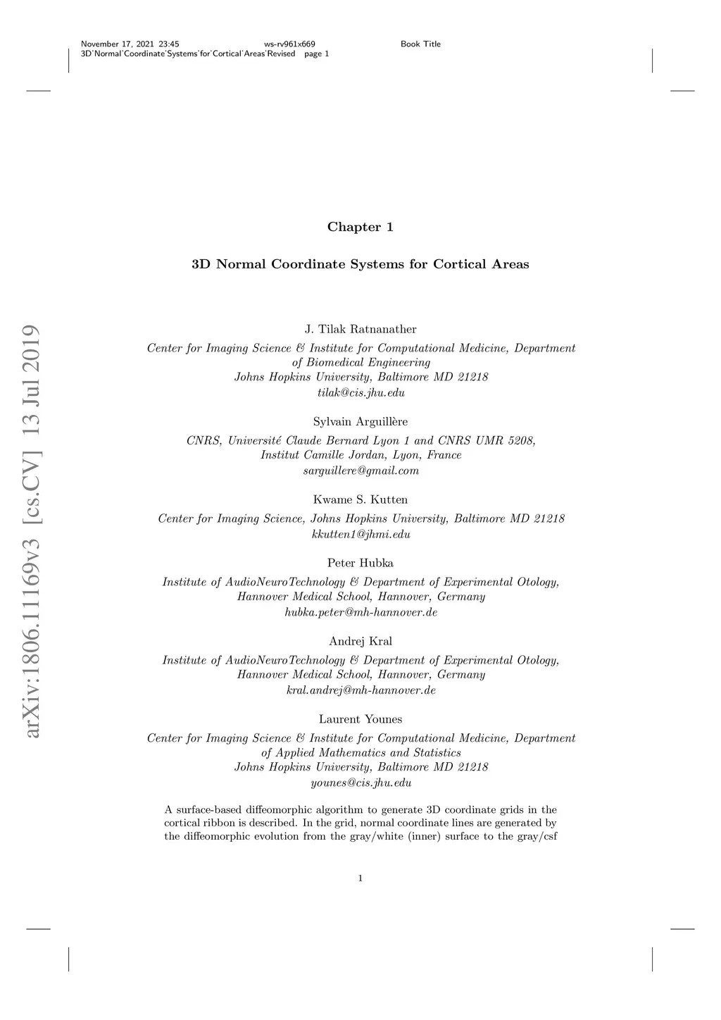 A surface-based diffeomorphic algorithm to generate 3D coordinate grids in the cortical ribbon is described. In the grid, normal coordinate lines are generated by the diffeomorphic evolution from the grey/white (inner) surface to the grey/csf (outer) surface. Specifically, the cortical ribbon is described by two triangulated surfaces with open boundaries. Conceptually, the inner surface sits on top of the white matter structure and the outer on top of the gray matter. It is assumed that the cortical ribbon consists of cortical columns which are orthogonal to the white matter surface. This might be viewed as a consequence of the development of the columns in the embryo. It is also assumed that the columns are orthogonal to the outer surface so that the resultant vector field is orthogonal to the evolving surface. Then the distance of the normal lines from the vector field such that the inner surface evolves diffeomorphically towards the outer one can be construed as a measure of thickness. Applications are described for the auditory cortices in human adults and cats with normal hearing or hearing loss. The approach offers great potential for cortical morphometry.