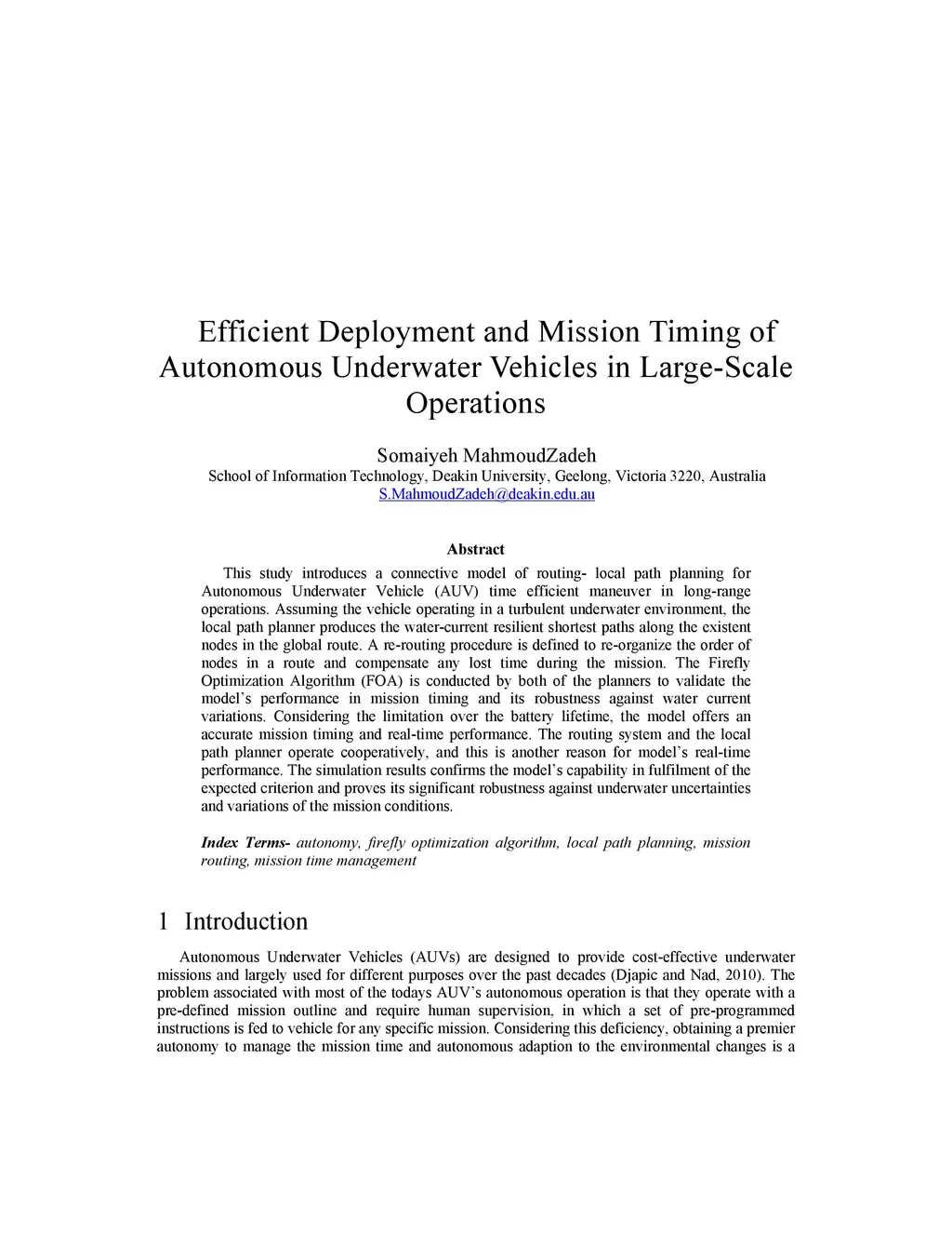 This study introduces a connective model of routing -- local path planning for Autonomous Underwater Vehicle (AUV) time efficient maneuver in long-range operations. Assuming the vehicle operating in a turbulent underwater environment, the local path planner produces the water-current resilient shortest paths along the existent nodes in the global route. A re-routing procedure is defined to re-organize the order of nodes in a route and compensate any lost time during the mission. The Firefly Optimization Algorithm (FOA) is conducted by both of the planners to validate the model's performance in mission timing and its robustness against water current variations. Considering the limitation over the battery life time, the model offers an accurate mission timing and real-time performance. The routing system and the local path planner operate cooperatively, and this is another reason for model's real-time performance. The simulation results confirms the model's capability in fulfillment of the expected criterion and proves its significant robustness against underwater uncertainties and variations of the mission conditions.