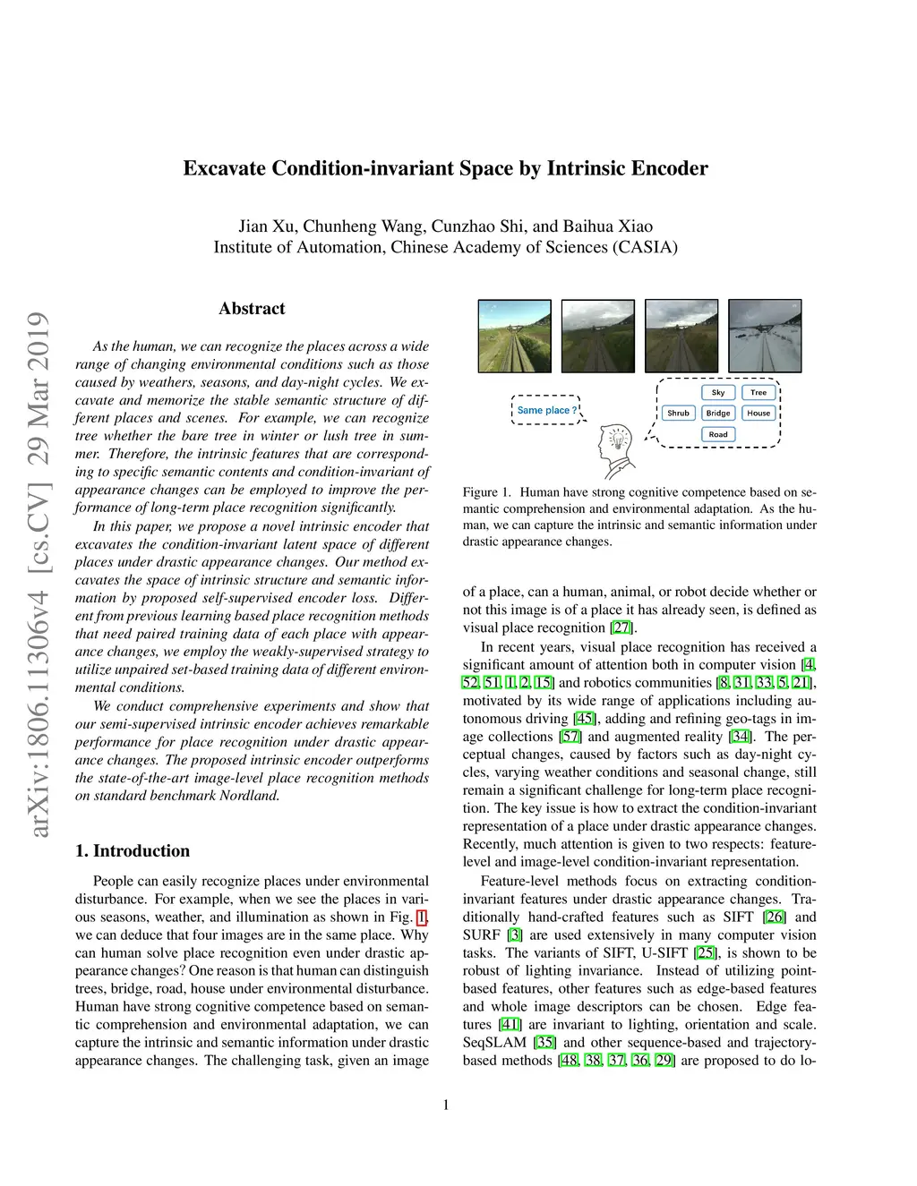 As the human, we can recognize the places across a wide range of changing environmental conditions such as those caused by weathers, seasons, and day-night cycles. We excavate and memorize the stable semantic structure of different places and scenes. For example, we can recognize tree whether the bare tree in winter or lush tree in summer. Therefore, the intrinsic features that are corresponding to specific semantic contents and condition-invariant of appearance changes can be employed to improve the performance of long-term place recognition significantly. In this paper, we propose a novel intrinsic encoder that excavates the condition-invariant latent space of different places under drastic appearance changes. Our method excavates the space of intrinsic structure and semantic information by proposed self-supervised encoder loss. Different from previous learning based place recognition methods that need paired training data of each place with appearance changes, we employ the weakly-supervised strategy to utilize unpaired set-based training data of different environmental conditions. We conduct comprehensive experiments and show that our semi-supervised intrinsic encoder achieves remarkable performance for place recognition under drastic appearance changes. The proposed intrinsic encoder outperforms the state-of-the-art image-level place recognition methods on standard benchmark Nordland.