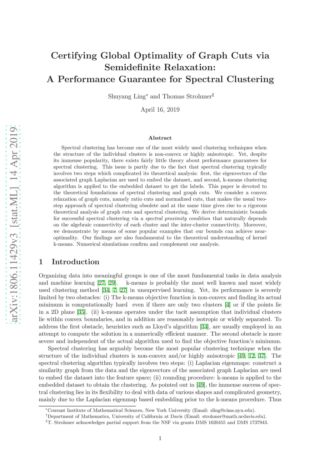 Spectral clustering has become one of the most widely used clustering techniques when the structure of the individual clusters is non-convex or highly anisotropic. Yet, despite its immense popularity, there exists fairly little theory about performance guarantees for spectral clustering. This issue is partly due to the fact that spectral clustering typically involves two steps which complicated its theoretical analysis: first, the eigenvectors of the associated graph Laplacian are used to embed the dataset, and second, k-means clustering algorithm is applied to the embedded dataset to get the labels. This paper is devoted to the theoretical foundations of spectral clustering and graph cuts. We consider a convex relaxation of graph cuts, namely ratio cuts and normalized cuts, that makes the usual two-step approach of spectral clustering obsolete and at the same time gives rise to a rigorous theoretical analysis of graph cuts and spectral clustering. We derive deterministic bounds for successful spectral clustering via a spectral proximity condition that naturally depends on the algebraic connectivity of each cluster and the inter-cluster connectivity. Moreover, we demonstrate by means of some popular examples that our bounds can achieve near-optimality. Our findings are also fundamental for the theoretical understanding of kernel k-means. Numerical simulations confirm and complement our analysis.