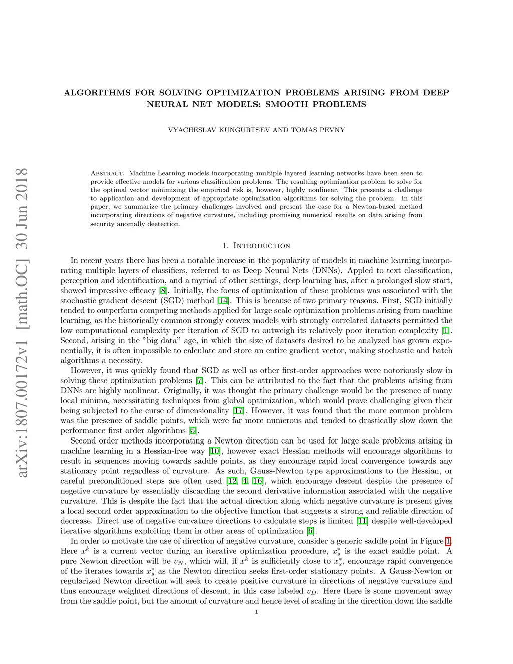 Machine Learning models incorporating multiple layered learning networks have been seen to provide effective models for various classification problems. The resulting optimization problem to solve for the optimal vector minimizing the empirical risk is, however, highly nonlinear. This presents a challenge to application and development of appropriate optimization algorithms for solving the problem. In this paper, we summarize the primary challenges involved and present the case for a Newton-based method incorporating directions of negative curvature, including promising numerical results on data arising from security anomally deetection.