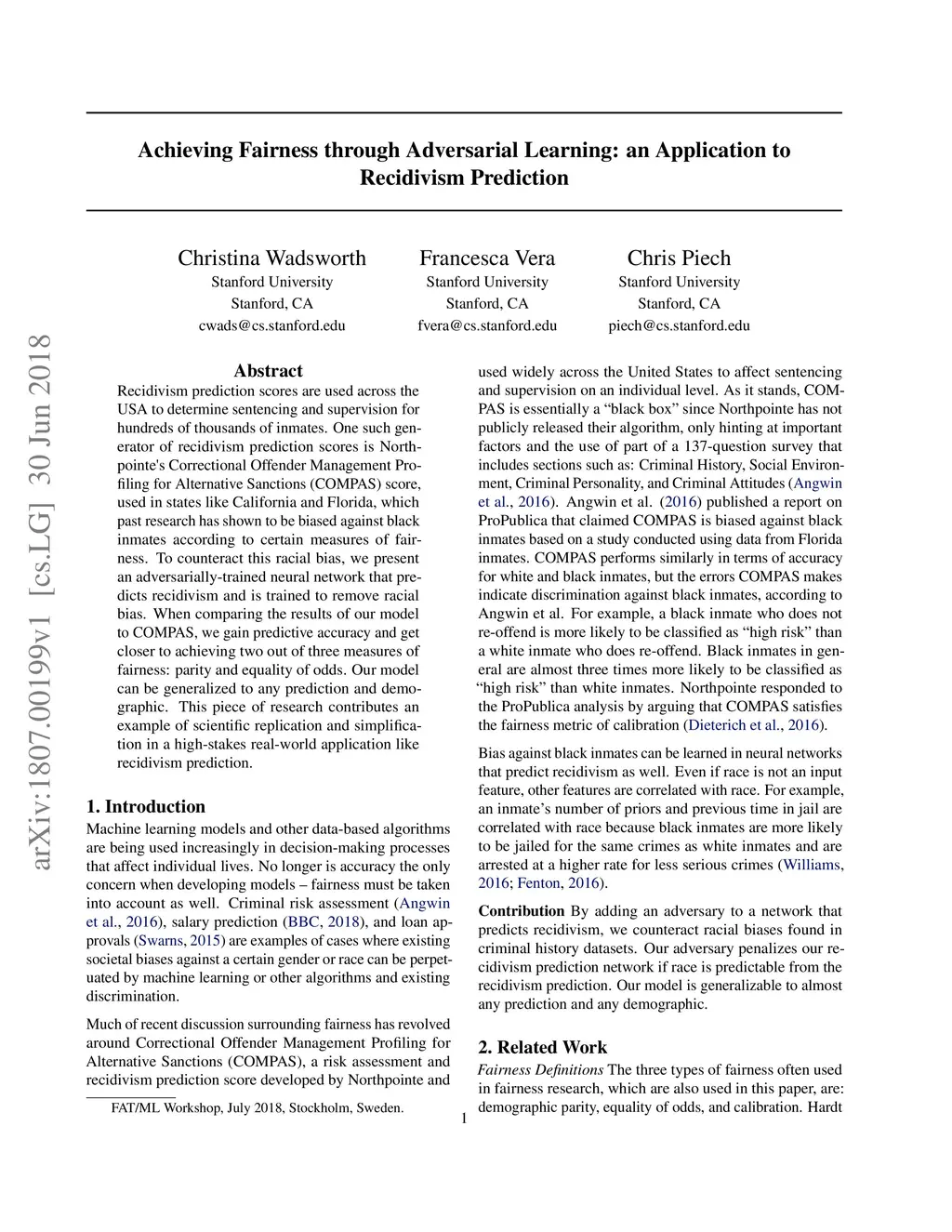 Recidivism prediction scores are used across the USA to determine sentencing and supervision for hundreds of thousands of inmates. One such generator of recidivism prediction scores is Northpointe's Correctional Offender Management Profiling for Alternative Sanctions (COMPAS) score, used in states like California and Florida, which past research has shown to be biased against black inmates according to certain measures of fairness. To counteract this racial bias, we present an adversarially-trained neural network that predicts recidivism and is trained to remove racial bias. When comparing the results of our model to COMPAS, we gain predictive accuracy and get closer to achieving two out of three measures of fairness: parity and equality of odds. Our model can be generalized to any prediction and demographic. This piece of research contributes an example of scientific replication and simplification in a high-stakes real-world application like recidivism prediction.