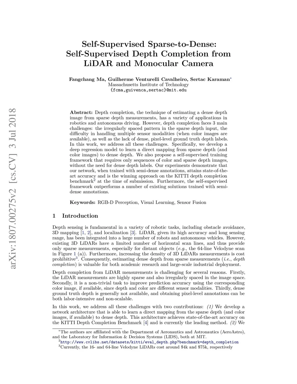 Depth completion, the technique of estimating a dense depth image from sparse depth measurements, has a variety of applications in robotics and autonomous driving. However, depth completion faces 3 main challenges: the irregularly spaced pattern in the sparse depth input, the difficulty in handling multiple sensor modalities (when color images are available), as well as the lack of dense, pixel-level ground truth depth labels. In this work, we address all these challenges. Specifically, we develop a deep regression model to learn a direct mapping from sparse depth (and color images) to dense depth. We also propose a self-supervised training framework that requires only sequences of color and sparse depth images, without the need for dense depth labels. Our experiments demonstrate that our network, when trained with semi-dense annotations, attains state-of-the- art accuracy and is the winning approach on the KITTI depth completion benchmark at the time of submission. Furthermore, the self-supervised framework outperforms a number of existing solutions trained with semi- dense annotations.