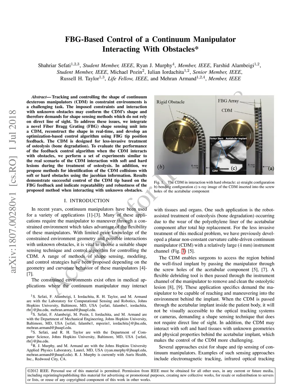 FBG-Based Control of a Continuum Manipulator Interacting With Obstacles