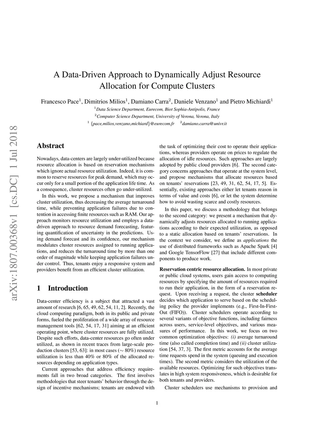 Nowadays, data-centers are largely under-utilized because resource allocation is based on reservation mechanisms which ignore actual resource utilization. Indeed, it is common to reserve resources for peak demand, which may occur only for a small portion of the application life time. As a consequence, cluster resources often go under-utilized. In this work, we propose a mechanism that improves cluster utilization, thus decreasing the average turnaround time, while preventing application failures due to contention in accessing finite resources such as RAM. Our approach monitors resource utilization and employs a data-driven approach to resource demand forecasting, featuring quantification of uncertainty in the predictions. Using demand forecast and its confidence, our mechanism modulates cluster resources assigned to running applications, and reduces the turnaround time by more than one order of magnitude while keeping application failures under control. Thus, tenants enjoy a responsive system and providers benefit from an efficient cluster utilization.