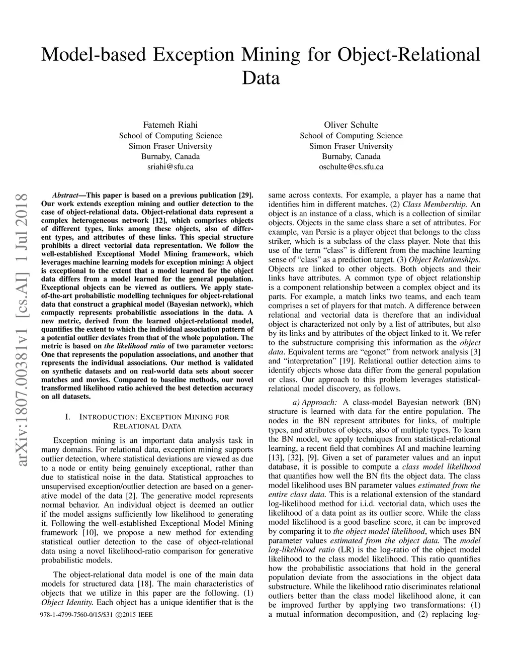 This paper is based on a previous publication [29]. Our work extends exception mining and outlier detection to the case of object-relational data. Object-relational data represent a complex heterogeneous network [12], which comprises objects of different types, links among these objects, also of different types, and attributes of these links. This special structure prohibits a direct vectorial data representation. We follow the well-established Exceptional Model Mining framework, which leverages machine learning models for exception mining: A object is exceptional to the extent that a model learned for the object data differs from a model learned for the general population. Exceptional objects can be viewed as outliers. We apply state of-the-art probabilistic modelling techniques for object-relational data that construct a graphical model (Bayesian network), which compactly represents probabilistic associations in the data. A new metric, derived from the learned object-relational model, quantifies the extent to which the individual association pattern of a potential outlier deviates from that of the whole population. The metric is based on the likelihood ratio of two parameter vectors: One that represents the population associations, and another that represents the individual associations. Our method is validated on synthetic datasets and on real-world data sets about soccer matches and movies. Compared to baseline methods, our novel transformed likelihood ratio achieved the best detection accuracy on all datasets.