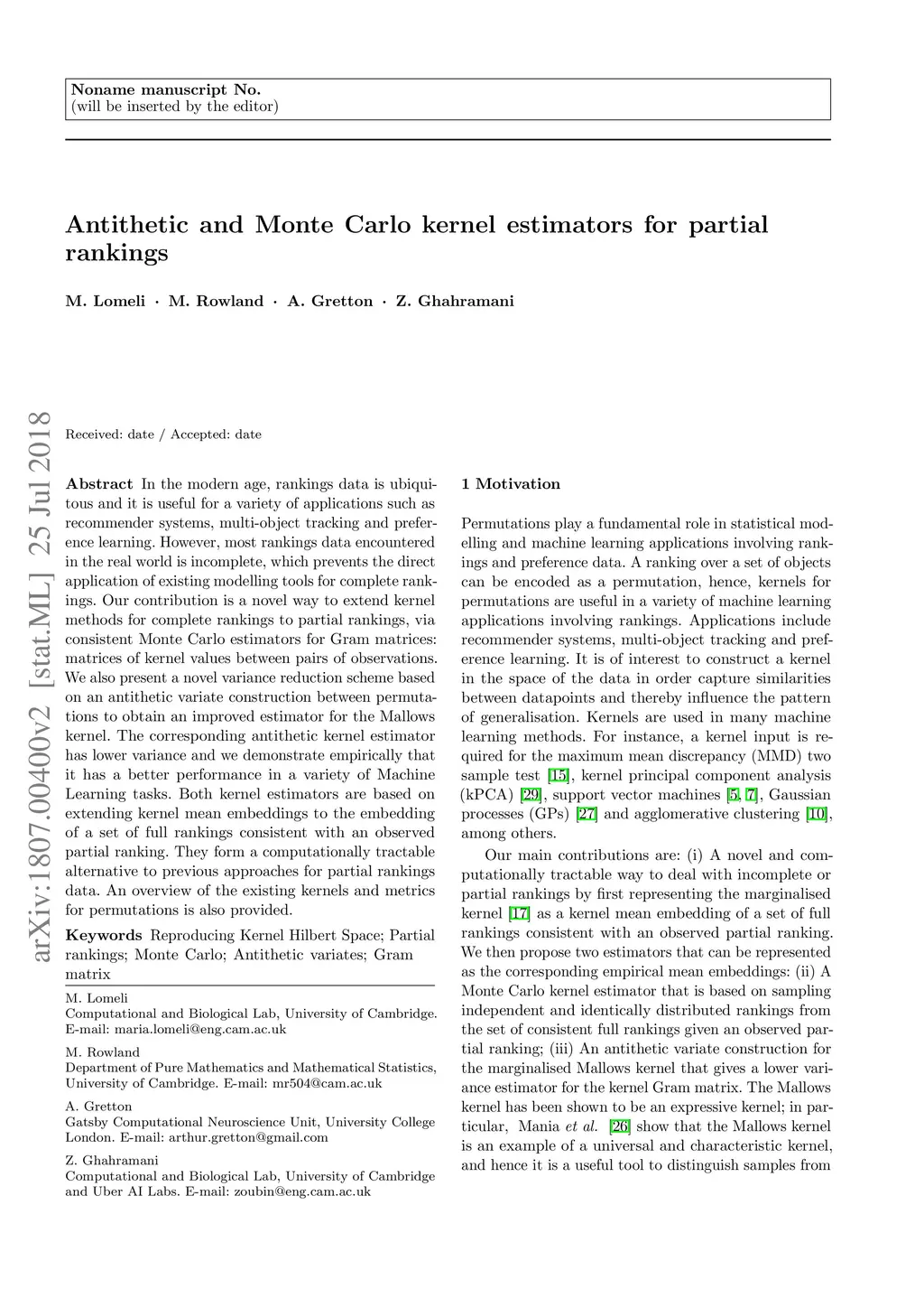Antithetic and Monte Carlo kernel estimators for partial rankings