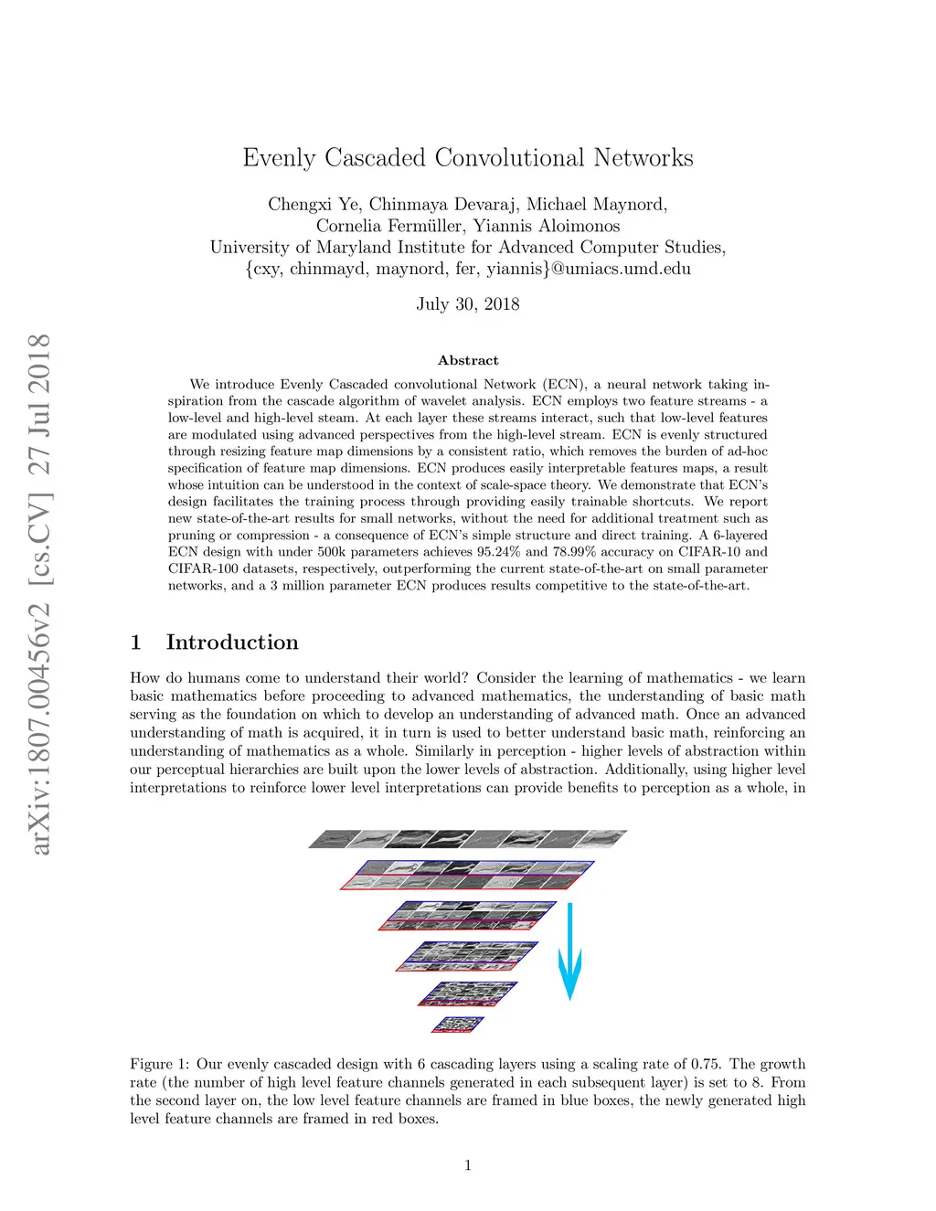 We introduce Evenly Cascaded convolutional Network (ECN), a neural network taking inspiration from the cascade algorithm of wavelet analysis. ECN employs two feature streams - a low-level and high-level steam. At each layer these streams interact, such that low-level features are modulated using advanced perspectives from the high-level stream. ECN is evenly structured through resizing feature map dimensions by a consistent ratio, which removes the burden of ad-hoc specification of feature map dimensions. ECN produces easily interpretable features maps, a result whose intuition can be understood in the context of scale-space theory. We demonstrate that ECN's design facilitates the training process through providing easily trainable shortcuts. We report new state-of-the-art results for small networks, without the need for additional treatment such as pruning or compression - a consequence of ECN's simple structure and direct training. A 6-layered ECN design with under 500k parameters achieves 95.24% and 78.99% accuracy on CIFAR-10 and CIFAR-100 datasets, respectively, outperforming the current state-of-the-art on small parameter networks, and a 3 million parameter ECN produces results competitive to the state-of-the-art.