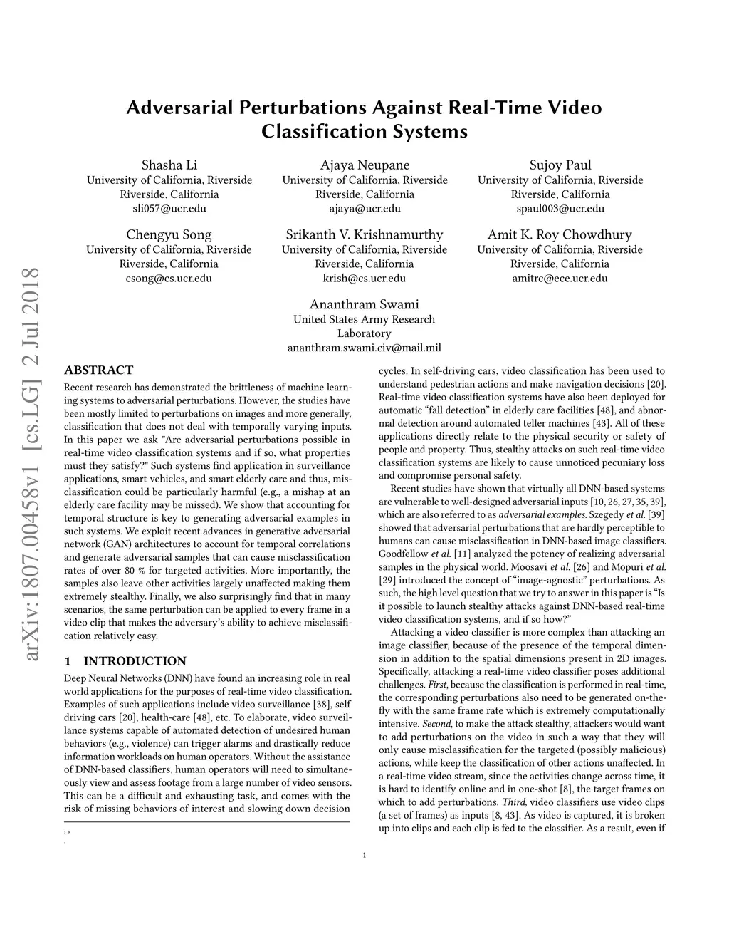 Recent research has demonstrated the brittleness of machine learning systems to adversarial perturbations. However, the studies have been mostly limited to perturbations on images and more generally, classification that does not deal with temporally varying inputs. In this paper we ask "Are adversarial perturbations possible in real-time video classification systems and if so, what properties must they satisfy?" Such systems find application in surveillance applications, smart vehicles, and smart elderly care and thus, misclassification could be particularly harmful (e.g., a mishap at an elderly care facility may be missed). We show that accounting for temporal structure is key to generating adversarial examples in such systems. We exploit recent advances in generative adversarial network (GAN) architectures to account for temporal correlations and generate adversarial samples that can cause misclassification rates of over 80% for targeted activities. More importantly, the samples also leave other activities largely unaffected making them extremely stealthy. Finally, we also surprisingly find that in many scenarios, the same perturbation can be applied to every frame in a video clip that makes the adversary's ability to achieve misclassification relatively easy.