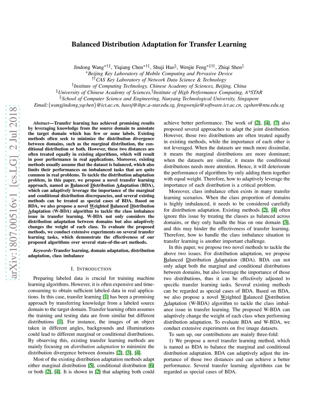 Transfer learning has achieved promising results by leveraging knowledge from the source domain to annotate the target domain which has few or none labels. Existing methods often seek to minimize the distribution divergence between domains, such as the marginal distribution, the conditional distribution or both. However, these two distances are often treated equally in existing algorithms, which will result in poor performance in real applications. Moreover, existing methods usually assume that the dataset is balanced, which also limits their performances on imbalanced tasks that are quite common in real problems. To tackle the distribution adaptation problem, in this paper, we propose a novel transfer learning approach, named as Balanced Distribution \underline{A}daptation~(BDA), which can adaptively leverage the importance of the marginal and conditional distribution discrepancies, and several existing methods can be treated as special cases of BDA. Based on BDA, we also propose a novel Weighted Balanced Distribution Adaptation~(W-BDA) algorithm to tackle the class imbalance issue in transfer learning. W-BDA not only considers the distribution adaptation between domains but also adaptively changes the weight of each class. To evaluate the proposed methods, we conduct extensive experiments on several transfer learning tasks, which demonstrate the effectiveness of our proposed algorithms over several state-of-the-art methods.