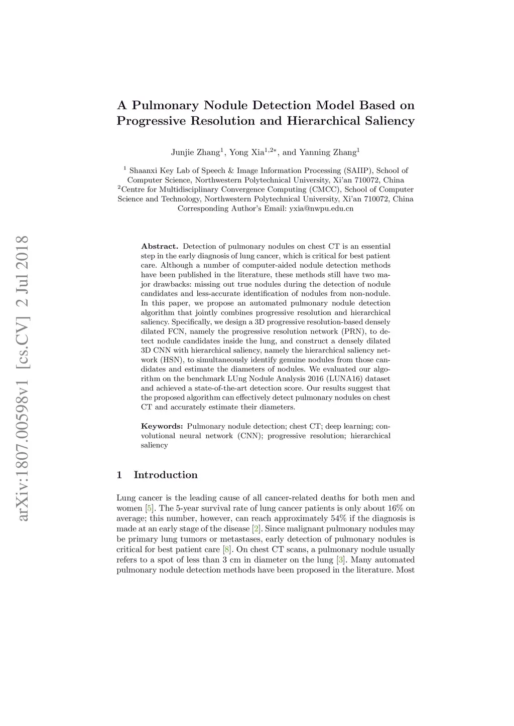 Detection of pulmonary nodules on chest CT is an essential step in the early diagnosis of lung cancer, which is critical for best patient care. Although a number of computer-aided nodule detection methods have been published in the literature, these methods still have two major drawbacks: missing out true nodules during the detection of nodule candidates and less-accurate identification of nodules from non-nodule. In this paper, we propose an automated pulmonary nodule detection algorithm that jointly combines progressive resolution and hierarchical saliency. Specifically, we design a 3D progressive resolution-based densely dilated FCN, namely the progressive resolution network (PRN), to detect nodule candidates inside the lung, and construct a densely dilated 3D CNN with hierarchical saliency, namely the hierarchical saliency network (HSN), to simultaneously identify genuine nodules from those candidates and estimate the diameters of nodules. We evaluated our algorithm on the benchmark LUng Nodule Analysis 2016 (LUNA16) dataset and achieved a state-of-the-art detection score. Our results suggest that the proposed algorithm can effectively detect pulmonary nodules on chest CT and accurately estimate their diameters.
