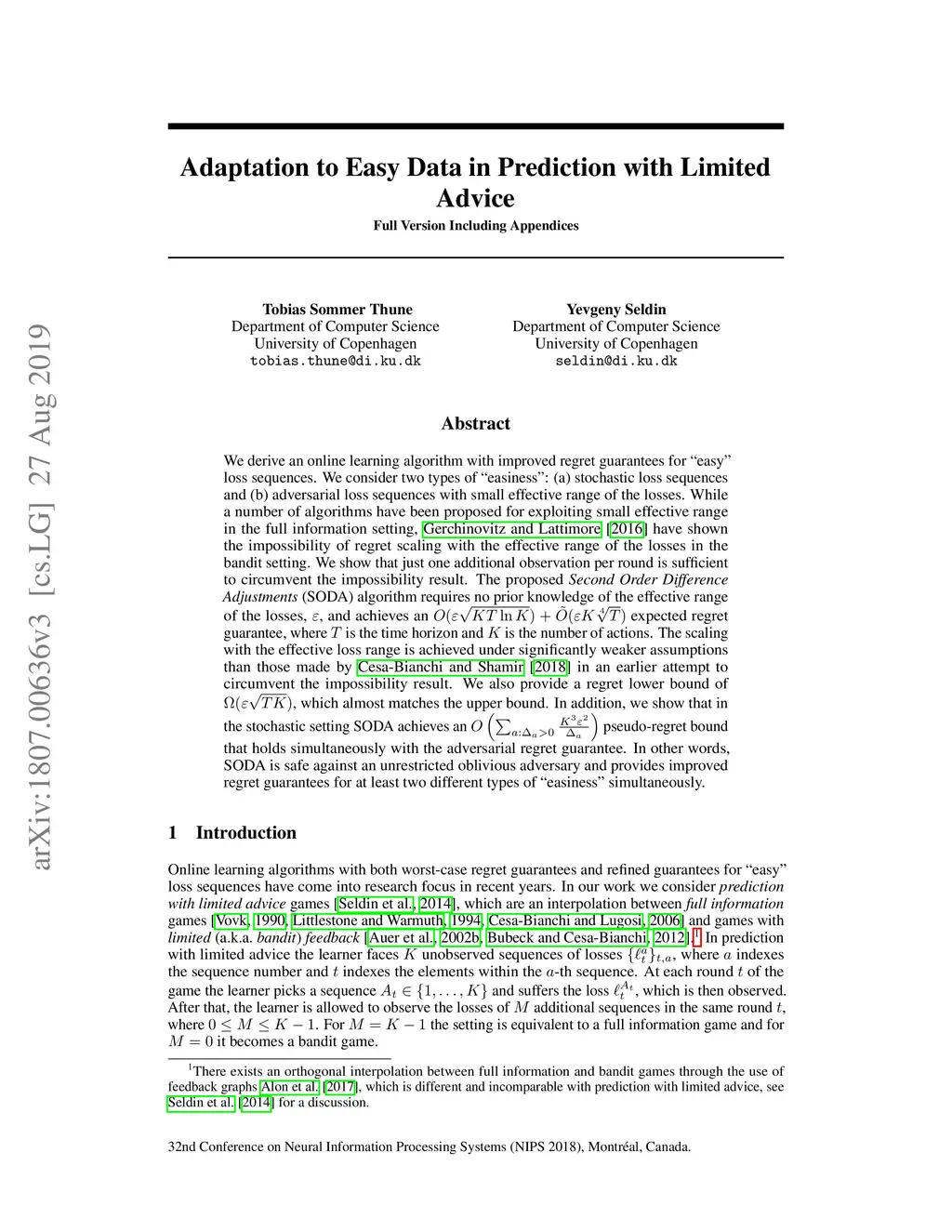 We derive an online learning algorithm with improved regret guarantees for `easy' loss sequences. We consider two types of `easiness': (a) stochastic loss sequences and (b) adversarial loss sequences with small effective range of the losses. While a number of algorithms have been proposed for exploiting small effective range in the full information setting, Gerchinovitz and Lattimore [2016] have shown the impossibility of regret scaling with the effective range of the losses in the bandit setting. We show that just one additional observation per round is sufficient to circumvent the impossibility result. The proposed Second Order Difference Adjustments (SODA) algorithm requires no prior knowledge of the effective range of the losses, , and achieves an expected regret guarantee, where is the time horizon and is the number of actions. The scaling with the effective loss range is achieved under significantly weaker assumptions than those made by Cesa-Bianchi and Shamir [2018] in an earlier attempt to circumvent the impossibility result. We also provide a regret lower bound of , which almost matches the upper bound. In addition, we show that in the stochastic setting SODA achieves an pseudo-regret bound that holds simultaneously with the adversarial regret guarantee. In other words, SODA is safe against an unrestricted oblivious adversary and provides improved regret guarantees for at least two different types of `easiness' simultaneously.