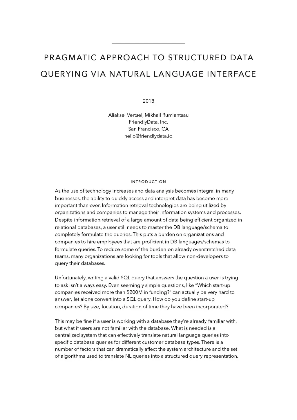 As the use of technology increases and data analysis becomes integral in many businesses, the ability to quickly access and interpret data has become more important than ever. Information retrieval technologies are being utilized by organizations and companies to manage their information systems and processes. Despite information retrieval of a large amount of data being efficient organized in relational databases, a user still needs to master the DB language/schema to completely formulate the queries. This puts a burden on organizations and companies to hire employees that are proficient in DB languages/schemas to formulate queries. To reduce some of the burden on already overstretched data teams, many organizations are looking for tools that allow non-developers to query their databases. Unfortunately, writing a valid SQL query that answers the question a user is trying to ask isn't always easy. Even seemingly simple questions, like "Which start-up companies received more than $200M in funding?" can actually be very hard to answer, let alone convert into a SQL query. How do you define start-up companies? By size, location, duration of time they have been incorporated? This may be fine if a user is working with a database they're already familiar with, but what if users are not familiar with the database. What is needed is a centralized system that can effectively translate natural language queries into specific database queries for different customer database types. There is a number of factors that can dramatically affect the system architecture and the set of algorithms used to translate NL queries into a structured query representation.