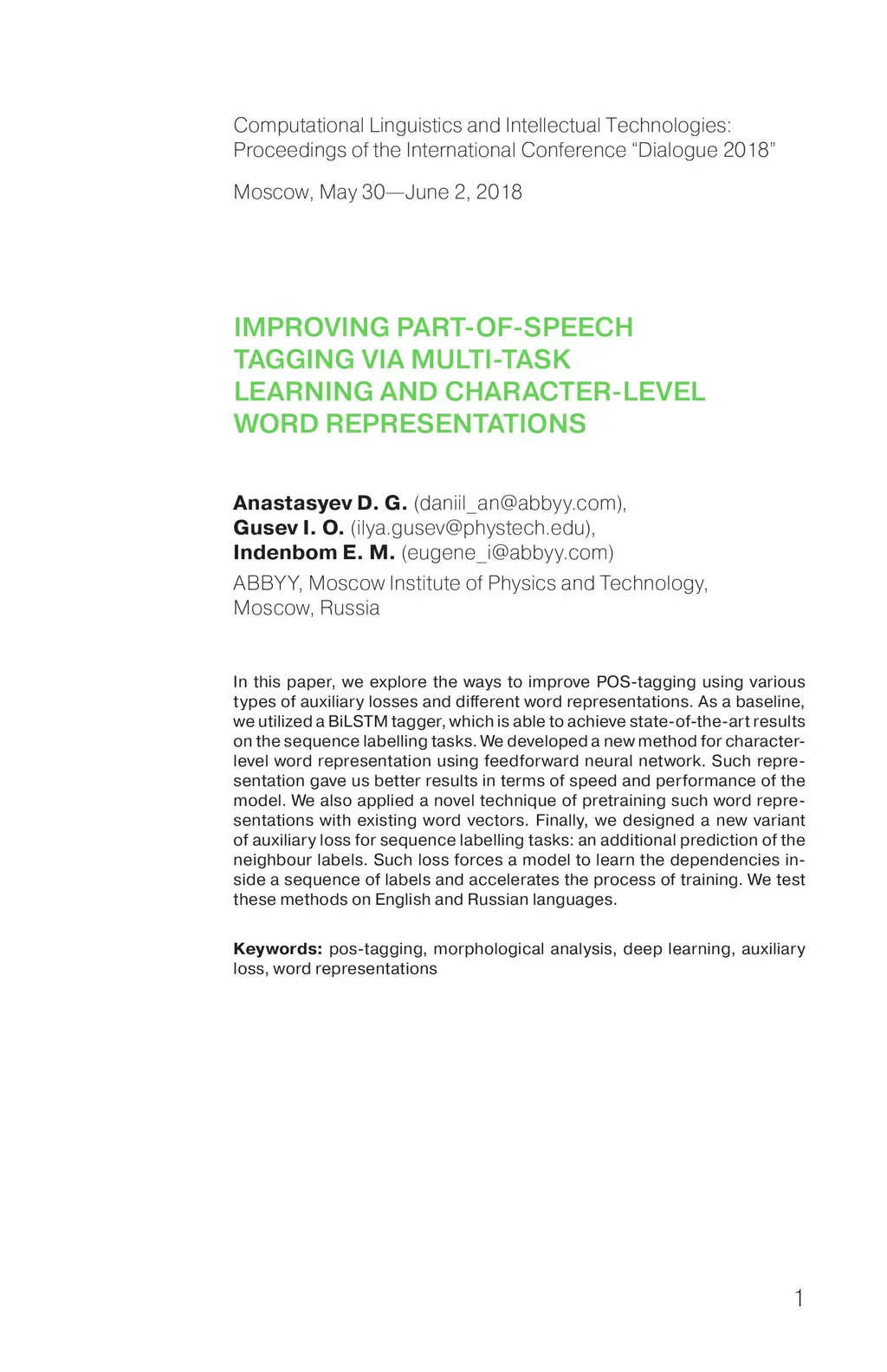 In this paper, we explore the ways to improve POS-tagging using various types of auxiliary losses and different word representations. As a baseline, we utilized a BiLSTM tagger, which is able to achieve state-of-the-art results on the sequence labelling tasks. We developed a new method for character-level word representation using feedforward neural network. Such representation gave us better results in terms of speed and performance of the model. We also applied a novel technique of pretraining such word representations with existing word vectors. Finally, we designed a new variant of auxiliary loss for sequence labelling tasks: an additional prediction of the neighbour labels. Such loss forces a model to learn the dependencies in-side a sequence of labels and accelerates the process of training. We test these methods on English and Russian languages.
