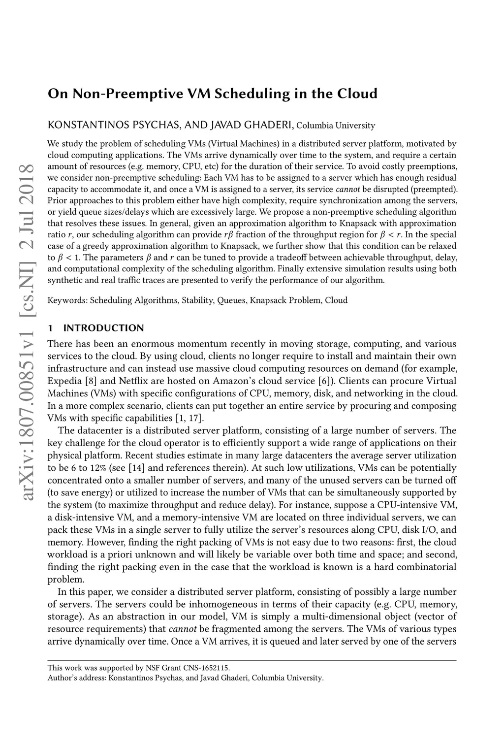We study the problem of scheduling VMs (Virtual Machines) in a distributed server platform, motivated by cloud computing applications. The VMs arrive dynamically over time to the system, and require a certain amount of resources (e.g. memory, CPU, etc) for the duration of their service. To avoid costly preemptions, we consider non-preemptive scheduling: Each VM has to be assigned to a server which has enough residual capacity to accommodate it, and once a VM is assigned to a server, its service \textit{cannot} be disrupted (preempted). Prior approaches to this problem either have high complexity, require synchronization among the servers, or yield queue sizes/delays which are excessively large. We propose a non-preemptive scheduling algorithm that resolves these issues. In general, given an approximation algorithm to Knapsack with approximation ratio , our scheduling algorithm can provide fraction of the throughput region for . In the special case of a greedy approximation algorithm to Knapsack, we further show that this condition can be relaxed to . The parameters and can be tuned to provide a tradeoff between achievable throughput, delay, and computational complexity of the scheduling algorithm. Finally extensive simulation results using both synthetic and real traffic traces are presented to verify the performance of our algorithm.