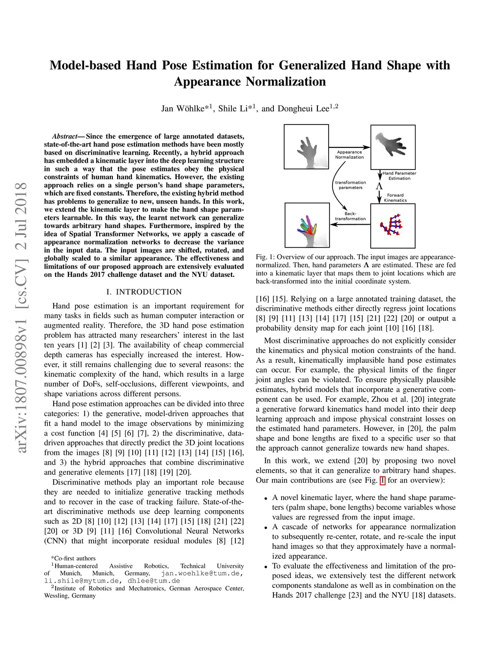 Since the emergence of large annotated datasets, state-of-the-art hand pose estimation methods have been mostly based on discriminative learning. Recently, a hybrid approach has embedded a kinematic layer into the deep learning structure in such a way that the pose estimates obey the physical constraints of human hand kinematics. However, the existing approach relies on a single person's hand shape parameters, which are fixed constants. Therefore, the existing hybrid method has problems to generalize to new, unseen hands. In this work, we extend the kinematic layer to make the hand shape parameters learnable. In this way, the learnt network can generalize towards arbitrary hand shapes. Furthermore, inspired by the idea of Spatial Transformer Networks, we apply a cascade of appearance normalization networks to decrease the variance in the input data. The input images are shifted, rotated, and globally scaled to a similar appearance. The effectiveness and limitations of our proposed approach are extensively evaluated on the Hands 2017 challenge dataset and the NYU dataset.