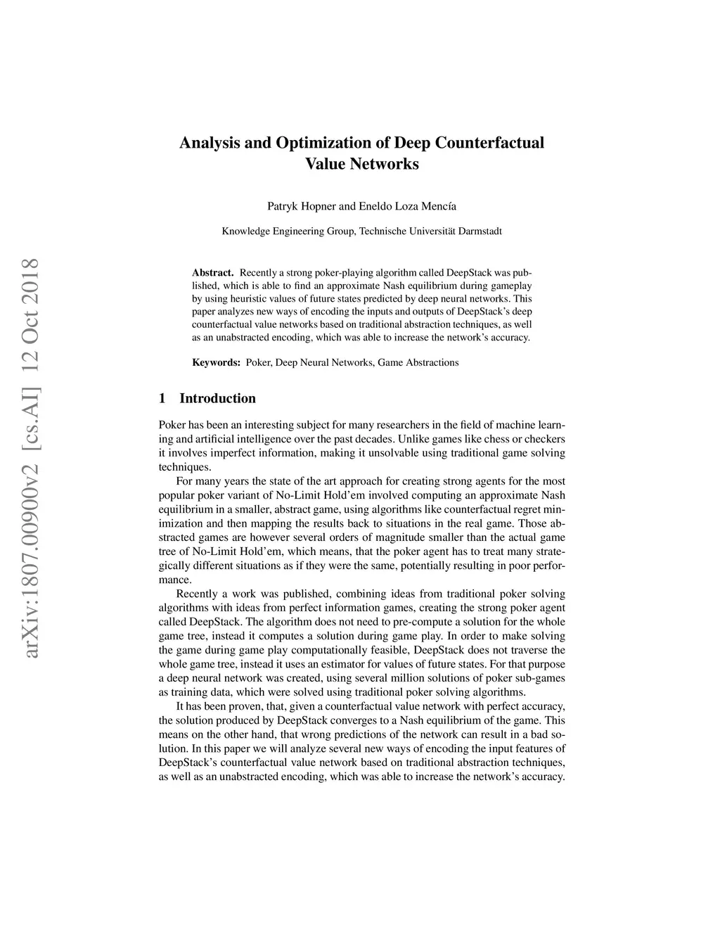 Recently a strong poker-playing algorithm called DeepStack was published, which is able to find an approximate Nash equilibrium during gameplay by using heuristic values of future states predicted by deep neural networks. This paper analyzes new ways of encoding the inputs and outputs of DeepStack's deep counterfactual value networks based on traditional abstraction techniques, as well as an unabstracted encoding, which was able to increase the network's accuracy.