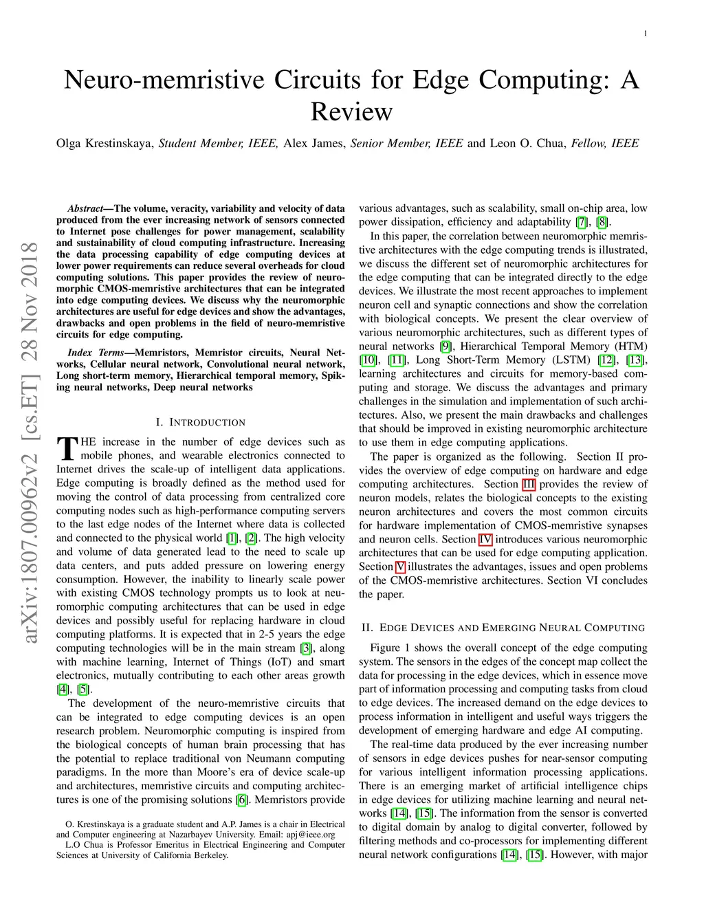 The volume, veracity, variability, and velocity of data produced from the ever-increasing network of sensors connected to Internet pose challenges for power management, scalability, and sustainability of cloud computing infrastructure. Increasing the data processing capability of edge computing devices at lower power requirements can reduce several overheads for cloud computing solutions. This paper provides the review of neuromorphic CMOS-memristive architectures that can be integrated into edge computing devices. We discuss why the neuromorphic architectures are useful for edge devices and show the advantages, drawbacks and open problems in the field of neuro-memristive circuits for edge computing.