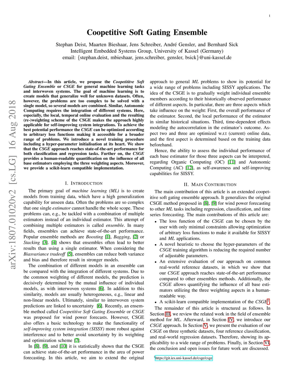 In this article, we propose the Coopetititve Soft Gating Ensemble or CSGE for general machine learning tasks and interwoven systems. The goal of machine learning is to create models that generalize well for unknown datasets. Often, however, the problems are too complex to be solved with a single model, so several models are combined. Similar, Autonomic Computing requires the integration of different systems. Here, especially, the local, temporal online evaluation and the resulting (re-)weighting scheme of the CSGE makes the approach highly applicable for self-improving system integrations. To achieve the best potential performance the CSGE can be optimized according to arbitrary loss functions making it accessible for a broader range of problems. We introduce a novel training procedure including a hyper-parameter initialisation at its heart. We show that the CSGE approach reaches state-of-the-art performance for both classification and regression tasks. Further on, the CSGE provides a human-readable quantification on the influence of all base estimators employing the three weighting aspects. Moreover, we provide a scikit-learn compatible implementation.