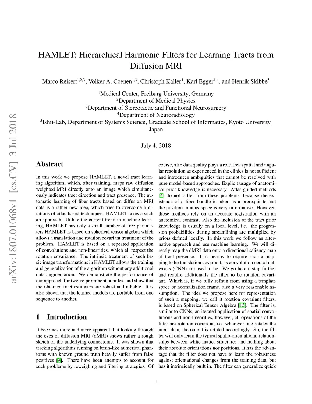 In this work we propose HAMLET, a novel tract learning algorithm, which, after training, maps raw diffusion weighted MRI directly onto an image which simultaneously indicates tract direction and tract presence. The automatic learning of fiber tracts based on diffusion MRI data is a rather new idea, which tries to overcome limitations of atlas-based techniques. HAMLET takes a such an approach. Unlike the current trend in machine learning, HAMLET has only a small number of free parameters HAMLET is based on spherical tensor algebra which allows a translation and rotation covariant treatment of the problem. HAMLET is based on a repeated application of convolutions and non-linearities, which all respect the rotation covariance. The intrinsic treatment of such basic image transformations in HAMLET allows the training and generalization of the algorithm without any additional data augmentation. We demonstrate the performance of our approach for twelve prominent bundles, and show that the obtained tract estimates are robust and reliable. It is also shown that the learned models are portable from one sequence to another.