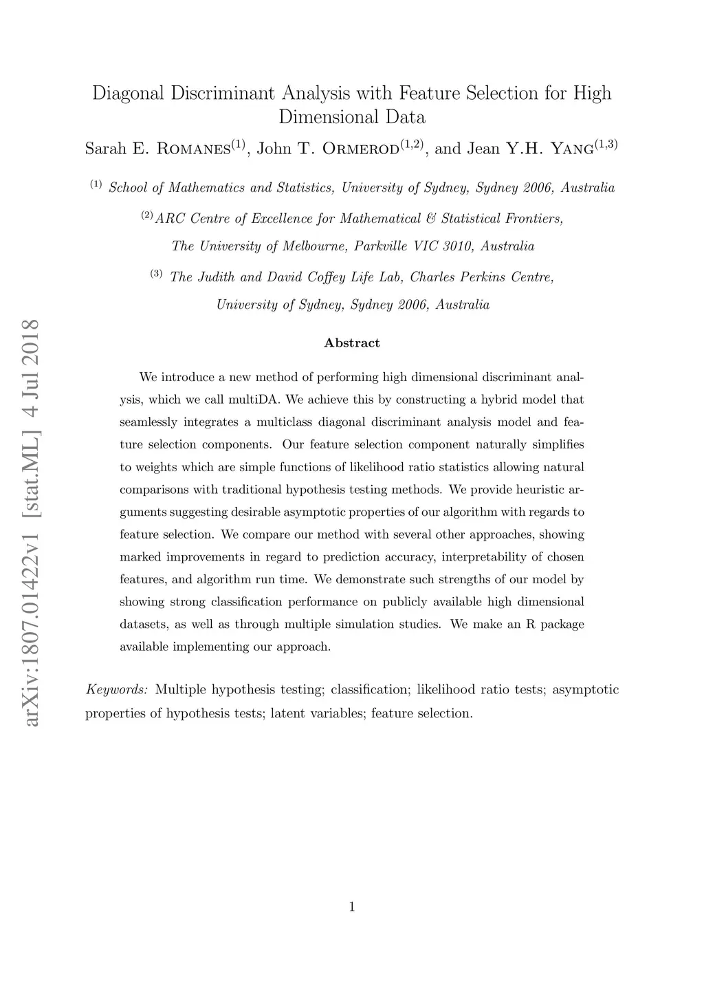 We introduce a new method of performing high dimensional discriminant analysis, which we call multiDA. We achieve this by constructing a hybrid model that seamlessly integrates a multiclass diagonal discriminant analysis model and feature selection components. Our feature selection component naturally simplifies to weights which are simple functions of likelihood ratio statistics allowing natural comparisons with traditional hypothesis testing methods. We provide heuristic arguments suggesting desirable asymptotic properties of our algorithm with regards to feature selection. We compare our method with several other approaches, showing marked improvements in regard to prediction accuracy, interpretability of chosen features, and algorithm run time. We demonstrate such strengths of our model by showing strong classification performance on publicly available high dimensional datasets, as well as through multiple simulation studies. We make an R package available implementing our approach.