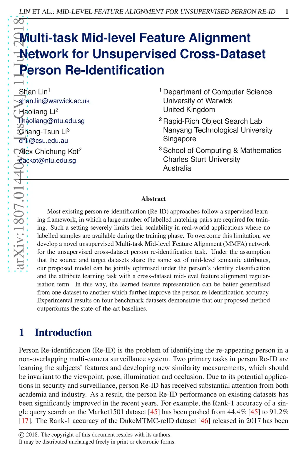 Most existing person re-identification (Re-ID) approaches follow a supervised learning framework, in which a large number of labelled matching pairs are required for training. Such a setting severely limits their scalability in real-world applications where no labelled samples are available during the training phase. To overcome this limitation, we develop a novel unsupervised Multi-task Mid-level Feature Alignment (MMFA) network for the unsupervised cross-dataset person re-identification task. Under the assumption that the source and target datasets share the same set of mid-level semantic attributes, our proposed model can be jointly optimised under the person's identity classification and the attribute learning task with a cross-dataset mid-level feature alignment regularisation term. In this way, the learned feature representation can be better generalised from one dataset to another which further improve the person re-identification accuracy. Experimental results on four benchmark datasets demonstrate that our proposed method outperforms the state-of-the-art baselines.