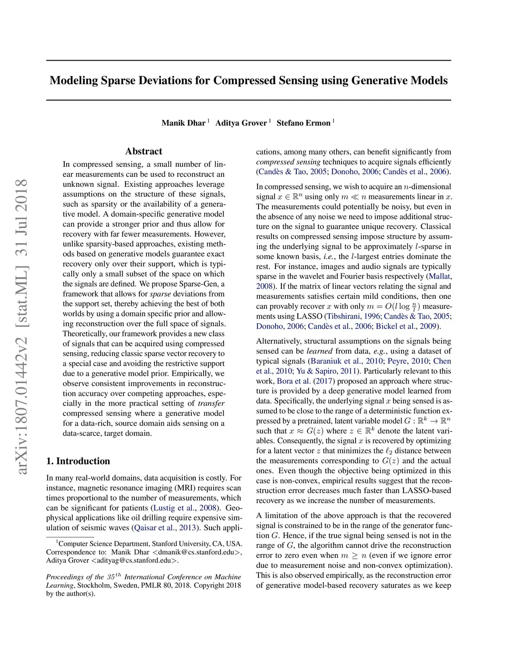 Modeling Sparse Deviations for Compressed Sensing using Generative