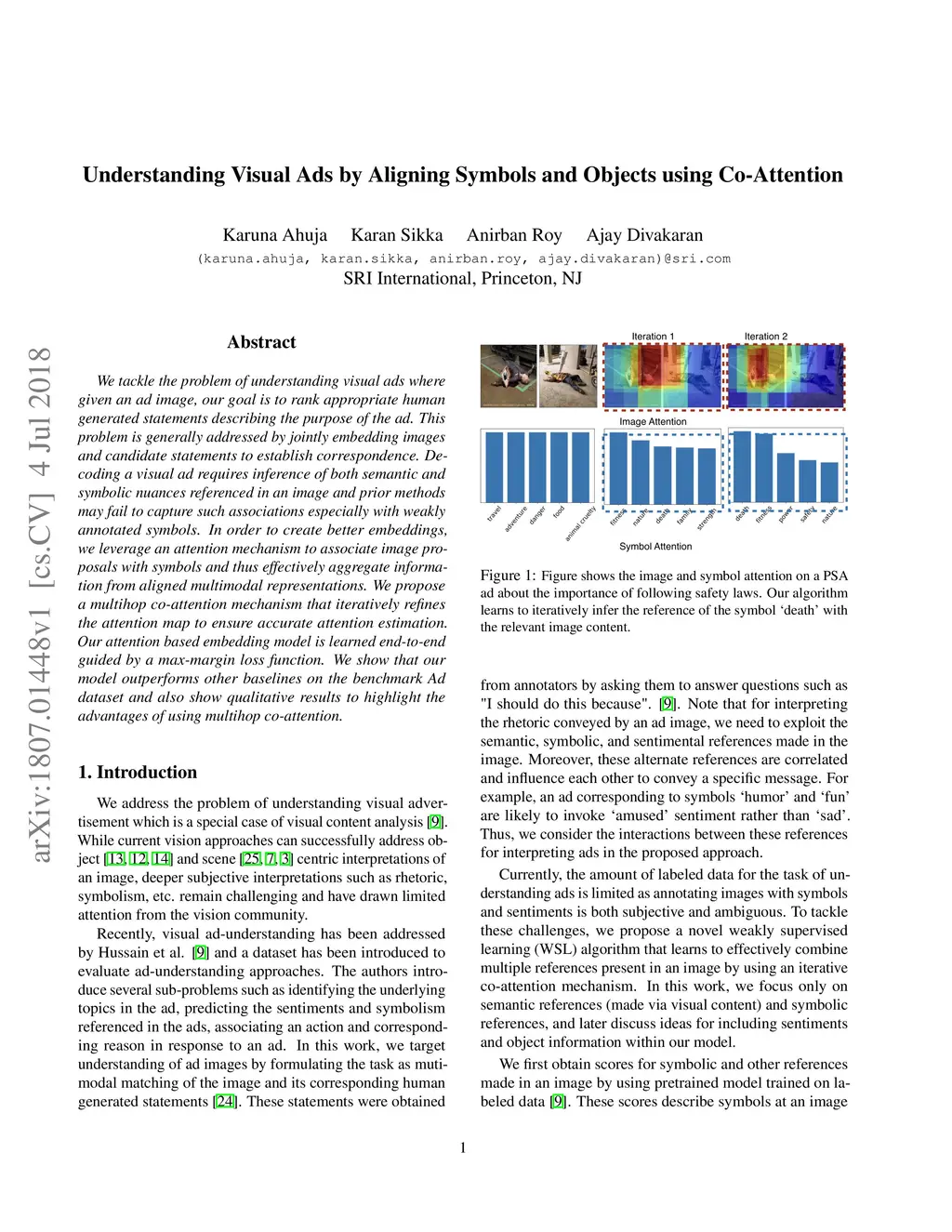 We tackle the problem of understanding visual ads where given an ad image, our goal is to rank appropriate human generated statements describing the purpose of the ad. This problem is generally addressed by jointly embedding images and candidate statements to establish correspondence. Decoding a visual ad requires inference of both semantic and symbolic nuances referenced in an image and prior methods may fail to capture such associations especially with weakly annotated symbols. In order to create better embeddings, we leverage an attention mechanism to associate image proposals with symbols and thus effectively aggregate information from aligned multimodal representations. We propose a multihop co-attention mechanism that iteratively refines the attention map to ensure accurate attention estimation. Our attention based embedding model is learned end-to-end guided by a max-margin loss function. We show that our model outperforms other baselines on the benchmark Ad dataset and also show qualitative results to highlight the advantages of using multihop co-attention.