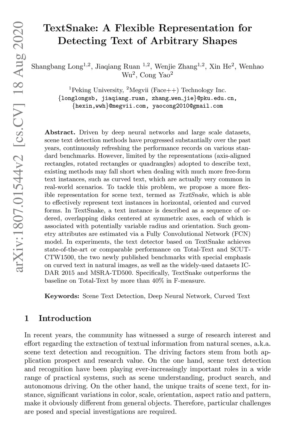 Driven by deep neural networks and large scale datasets, scene text detection methods have progressed substantially over the past years, continuously refreshing the performance records on various standard benchmarks. However, limited by the representations (axis-aligned rectangles, rotated rectangles or quadrangles) adopted to describe text, existing methods may fall short when dealing with much more free-form text instances, such as curved text, which are actually very common in real-world scenarios. To tackle this problem, we propose a more flexible representation for scene text, termed as TextSnake, which is able to effectively represent text instances in horizontal, oriented and curved forms. In TextSnake, a text instance is described as a sequence of ordered, overlapping disks centered at symmetric axes, each of which is associated with potentially variable radius and orientation. Such geometry attributes are estimated via a Fully Convolutional Network (FCN) model. In experiments, the text detector based on TextSnake achieves state-of-the-art or comparable performance on Total-Text and SCUT-CTW1500, the two newly published benchmarks with special emphasis on curved text in natural images, as well as the widely-used datasets ICDAR 2015 and MSRA-TD500. Specifically, TextSnake outperforms the baseline on Total-Text by more than 40% in F-measure.