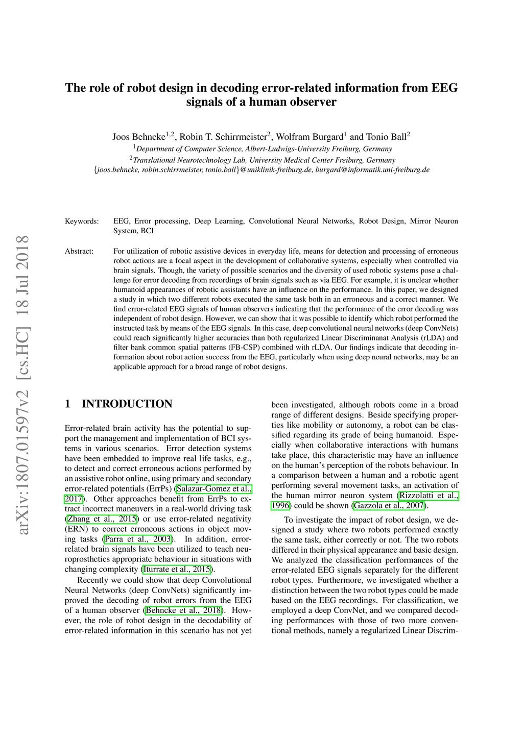 For utilization of robotic assistive devices in everyday life, means for detection and processing of erroneous robot actions are a focal aspect in the development of collaborative systems, especially when controlled via brain signals. Though, the variety of possible scenarios and the diversity of used robotic systems pose a challenge for error decoding from recordings of brain signals such as via EEG. For example, it is unclear whether humanoid appearances of robotic assistants have an influence on the performance. In this paper, we designed a study in which two different robots executed the same task both in an erroneous and a correct manner. We find error-related EEG signals of human observers indicating that the performance of the error decoding was independent of robot design. However, we can show that it was possible to identify which robot performed the instructed task by means of the EEG signals. In this case, deep convolutional neural networks (deep ConvNets) could reach significantly higher accuracies than both regularized Linear Discriminanat Analysis (rLDA) and filter bank common spatial patterns (FB-CSP) combined with rLDA. Our findings indicate that decoding information about robot action success from the EEG, particularly when using deep neural networks, may be an applicable approach for a broad range of robot designs.