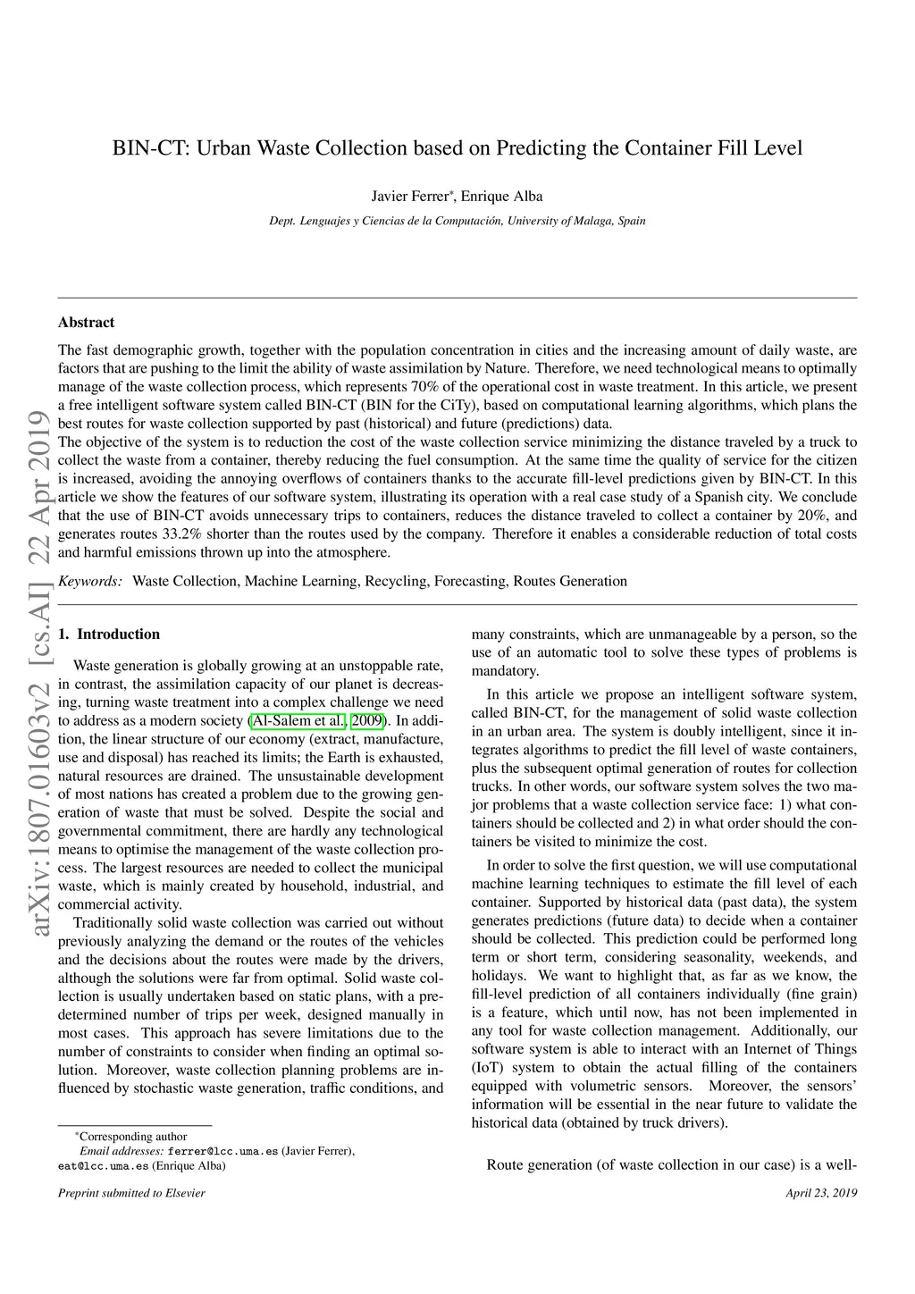 The fast demographic growth, together with the concentration of the population in cities and the increasing amount of daily waste, are factors that push to the limit the ability of waste assimilation by Nature. Therefore, we need technological means to make an optimal management of the waste collection process, which represents 70% of the operational cost in waste treatment. In this article, we present a free intelligent software system, based on computational learning algorithms, which plans the best routes for waste collection supported by past (historical) and future (predictions) data. The objective of the system is the cost reduction of the waste collection service by means of the minimization in distance traveled by any truck to collect a container, hence the fuel consumption. At the same time the quality of service to the citizen is increased avoiding the annoying overflows of containers thanks to the accurate fill level predictions performed by BIN-CT. In this article we show the features of our software system, illustrating it operation with a real case study of a Spanish city. We conclude that the use of BIN-CT avoids unnecessary visits to containers, reduces the distance traveled to collect a container and therefore we obtain a reduction of total costs and harmful emissions thrown to the atmosphere.