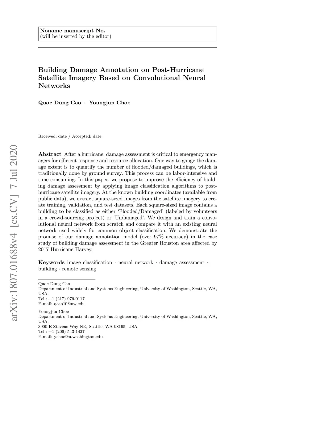 After a hurricane, damage assessment is critical to emergency managers for efficient response and resource allocation. One way to gauge the damage extent is to quantify the number of flooded/damaged buildings, which is traditionally done by ground survey. This process can be labor-intensive and time-consuming. In this paper, we propose to improve the efficiency of building damage assessment by applying image classification algorithms to post-hurricane satellite imagery. At the known building coordinates (available from public data), we extract square-sized images from the satellite imagery to create training, validation, and test datasets. Each square-sized image contains a building to be classified as either 'Flooded/Damaged' (labeled by volunteers in a crowd-sourcing project) or Úndamaged'. We design and train a convolutional neural network from scratch and compare it with an existing neural network used widely for common object classification. We demonstrate the promise of our damage annotation model (over 97% accuracy) in the case study of building damage assessment in the Greater Houston area affected by 2017 Hurricane Harvey.