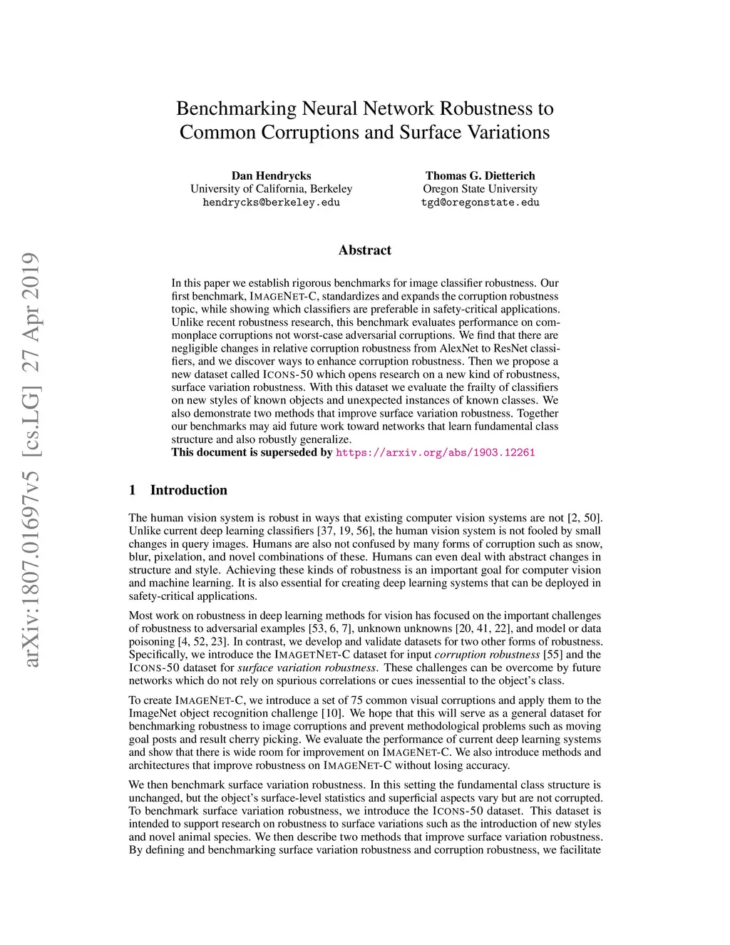 In this paper we establish rigorous benchmarks for image classifier robustness. Our first benchmark, ImageNet-C, standardizes and expands the corruption robustness topic, while showing which classifiers are preferable in safety-critical applications. Unlike recent robustness research, this benchmark evaluates performance on commonplace corruptions not worst-case adversarial corruptions. We find that there are negligible changes in relative corruption robustness from AlexNet to ResNet classifiers, and we discover ways to enhance corruption robustness. Then we propose a new dataset called Icons-50 which opens research on a new kind of robustness, surface variation robustness. With this dataset we evaluate the frailty of classifiers on new styles of known objects and unexpected instances of known classes. We also demonstrate two methods that improve surface variation robustness. Together our benchmarks may aid future work toward networks that learn fundamental class structure and also robustly generalize.