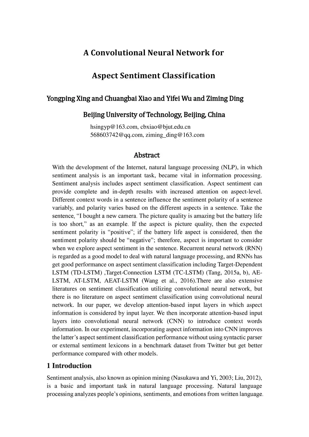 A Convolutional Neural Network for Aspect Sentiment Classification