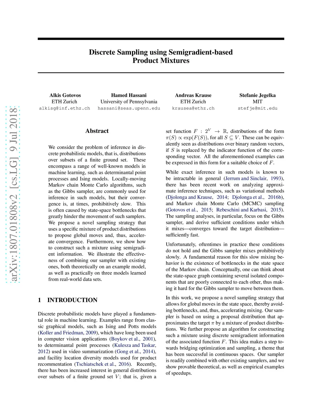 We consider the problem of inference in discrete probabilistic models, that is, distributions over subsets of a finite ground set. These encompass a range of well-known models in machine learning, such as determinantal point processes and Ising models. Locally-moving Markov chain Monte Carlo algorithms, such as the Gibbs sampler, are commonly used for inference in such models, but their convergence is, at times, prohibitively slow. This is often caused by state-space bottlenecks that greatly hinder the movement of such samplers. We propose a novel sampling strategy that uses a specific mixture of product distributions to propose global moves and, thus, accelerate convergence. Furthermore, we show how to construct such a mixture using semigradient information. We illustrate the effectiveness of combining our sampler with existing ones, both theoretically on an example model, as well as practically on three models learned from real-world data sets.