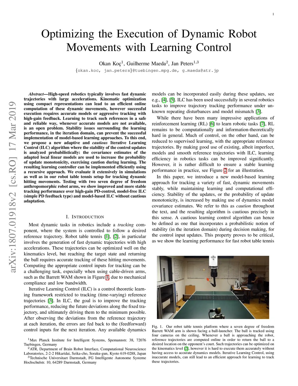 Highly dynamic tasks that require large accelerations and precise tracking usually rely on accurate models and/or high gain feedback. While kinematic optimization allows for efficient representation and online generation of hitting trajectories, learning to track such dynamic movements with inaccurate models remains an open problem. In particular, stability issues surrounding the learning performance, in the iteration domain, can prevent the successful implementation of model based learning approaches. To achieve accurate tracking for such tasks in a stable and efficient way, we propose a new adaptive Iterative Learning Control (ILC) algorithm that is implemented efficiently using a recursive approach. Moreover, covariance estimates of model matrices are used to exercise caution during learning. We evaluate the performance of the proposed approach in extensive simulations and in our robotic table tennis platform, where we show how the striking performance of two seven degree of freedom anthropomorphic robot arms can be optimized. Our implementation on the table tennis platform compares favorably with high-gain PD-control, model-free ILC (simple PD feedback type) and model-based ILC without cautious adaptation.