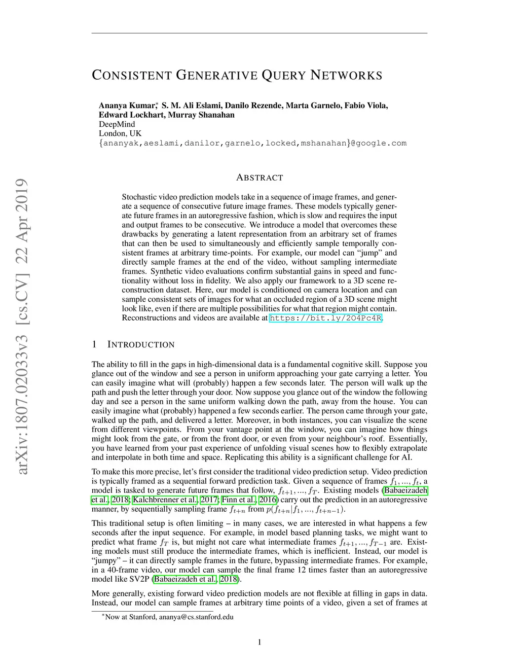 Stochastic video prediction models take in a sequence of image frames, and generate a sequence of consecutive future image frames. These models typically generate future frames in an autoregressive fashion, which is slow and requires the input and output frames to be consecutive. We introduce a model that overcomes these drawbacks by generating a latent representation from an arbitrary set of frames that can then be used to simultaneously and efficiently sample temporally consistent frames at arbitrary time-points. For example, our model can "jump" and directly sample frames at the end of the video, without sampling intermediate frames. Synthetic video evaluations confirm substantial gains in speed and functionality without loss in fidelity. We also apply our framework to a 3D scene reconstruction dataset. Here, our model is conditioned on camera location and can sample consistent sets of images for what an occluded region of a 3D scene might look like, even if there are multiple possibilities for what that region might contain. Reconstructions and videos are available at https://bit.ly/2O4Pc4R.